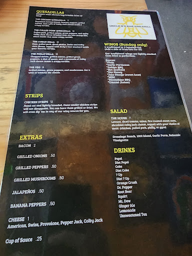 Sunday is Smoked Wing Day & I stopped in to get some for the very first time. I ordered 6 plain wings & fries to go. I got exactly 6 pieces of chicken--3 drums and 3 wing pieces. I paid cash and had a wing when I got home; delicious!! Fries were hot and not really salty, which was fine with me! I put the rest in the refrigerator after I lined the Styrofoam container with paper towels to contain excess fat. I reheated the remaining wings and fries on a plate in the microwave on Monday evening; still delicious! Atmosphere in the bar was a little noisy for me, but I don't frequent bars since I don't drink alcohol. TV's we're on with sports and patrons were talking and laughing with each other at their tables as they drank and enjoyed their food. Everything was clean, neat and orderly! Bar was continually being wiped down & glasses washed. I got a few glances from some people, since I had my coat and earmuffs on: I was by the door & it was a cold day. I should have asked how many pieces constituted a wing; in the fry station of a grocery store where I once worked, a wing was the complete item, including the tip; at Uncle B's each piece is considered a wing. Big difference; but lesson learned. Food was great, price was about $2/ piece of chicken, so I'll have a better idea what to order again! Don't miss out-- these wings are wonderful; and they also have boneless wings too! I got the bone-in wings, since I prefer that type. I may have to sample a couple of sauces too next time before I order! It was $12+ some change; I would have liked a receipt, but I'll ask for...