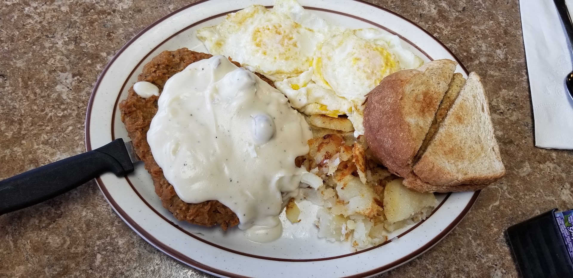 It's hard to say which was our favorite... homestyle potatoes, fluffy buttery pancakes, crispy bacon, eggs or chichen fried steak with gravy. Everything was seasoned just right. We enjoyed everything.