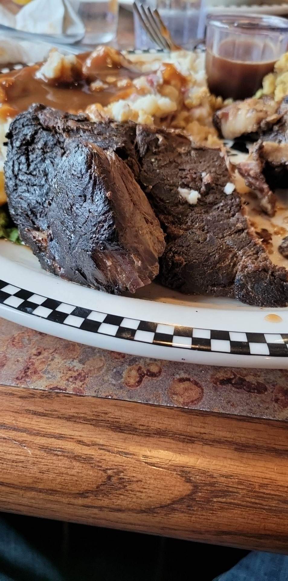 Read moreFirst time customer. Last time too. Came here for a nice Christmas lunch. Walked in the door. No line. Seated immediately. I was asked if I needed a high chair for my baby. I said yes. He never brought it. I had to go get it myself. No biggie. I started with a sweet tea and was brought water with a hint of color in it. I intended to ask the waitress about it but after taking our drink order it took her so long to come back the ice had melted. So I just replaced it with a soda. Which I wanted to avoid. So far was still having an okay time. But then I ordered the prime rib dinner and the wife ordered the turkey dinner. Both of us received the coldest of sides and sad excuse for stuffing. The turkey was okay. I tried it. But my prime rib never showed. Instead I has been brought a rump of roast beef. I've attached pictures. No part of this was prime. It was hard, cold and dried up. Smelled and looked like arbys roast beef. I was just gonna have my waitress replace it . But she never ever came back. Literally. She took our drink order and our food order. The only 2 times she ever came to my table. 40 minutes pass and I had accidently nibbled through this plate of dead, horrible and cold food. Then instead of my waitress coming she sends out what looks like the dish washer to hand me my bill. This I where I finally complained. I called the manager. He didn't even know what to say. Don't blame him. It was a fkd situation. All and all place looked good. But The food, host, waiter and dishwasher guy really ruined my day. It looked like a restaurant that's the only part of this review you get a star for. This place is awful. Dont go. It's missing all the rest of the details that make a restaurant. My wife has wanted me to try black bear dinner since i moved here 3 years ago. You really embarrassed her with this sad excuse for service.
