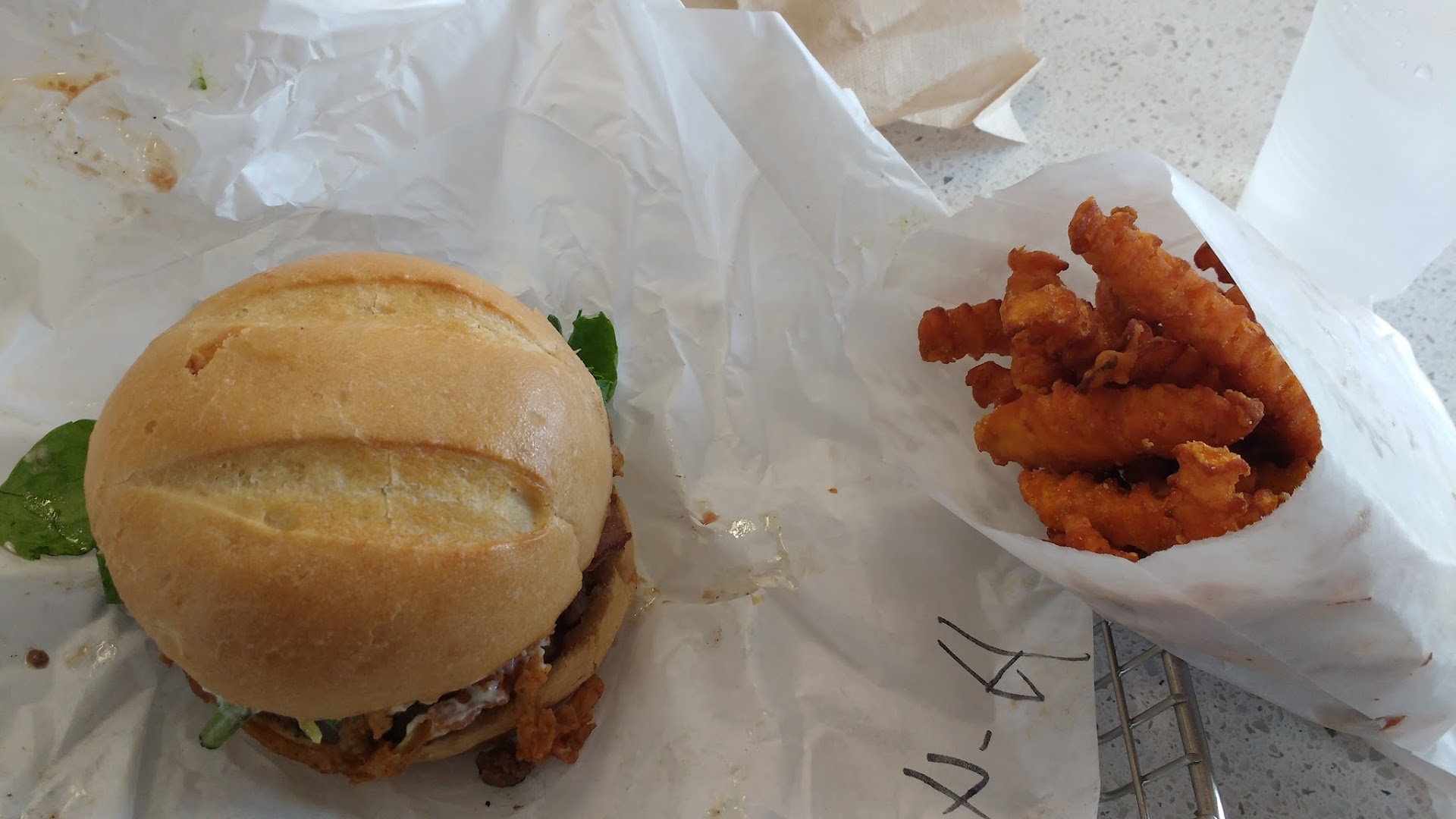 PRODUCT/SERVICE - 5 The burger was delicious. I ordered the Houdini. It was magically filling as well as delicious. The Sweet Potato fries were ok, I was anticipating something a little more sharp in taste.