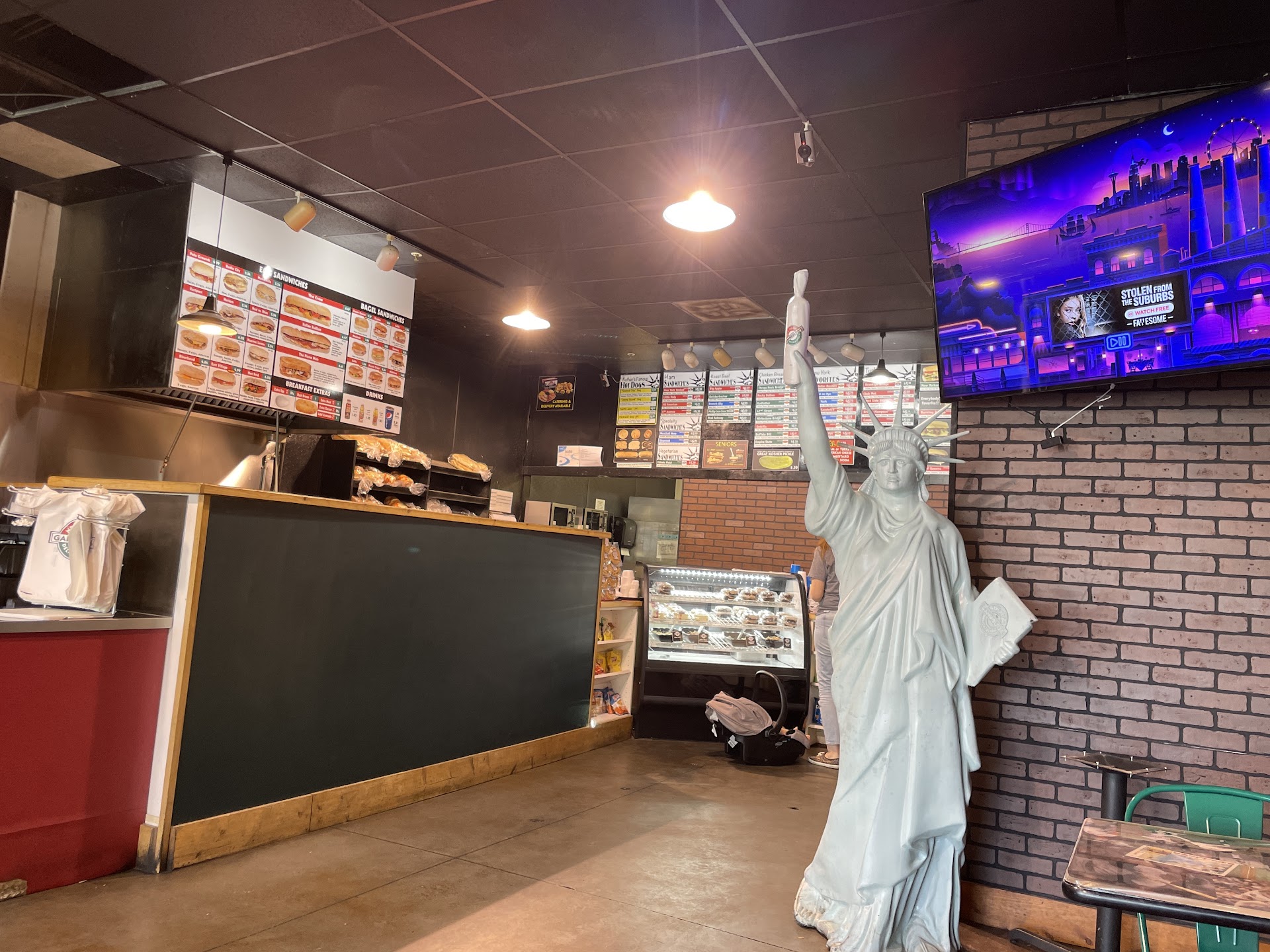 The nice thing is that they're totally accommodating to strange or different tastes. I like ordering the Manorville here, holding the Salt & Pepper and substituting either swiss cheese or cheddar cheese in lieu of the American cheese. Despite the higher quality of cheese being used, they charge me $0.00 extra. Nothin'. Also, the staff are genuine and kind people, who work hard for their customers. The owner is often working in the deli as well, showing that you can lead the charge from the front. He is patient, kind, and very appreciative of business coming through. The quality of their deli meats and cheeses is superb, and I'm always pleased with my food when I order here. There's a young lady who generally has very short-cropped hair that is a student full time, she's probably the nicest person there, and that's...