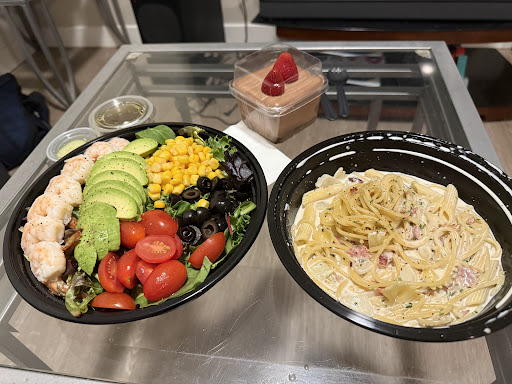 I was immediately greeted and the gentleman was looking over the menu with me to help me decide on what to get. He recommended the Carbonara for pasta and Shrimp & Avocado for the salad. He suggested I try the meat pies, Risotto and the Tri-Tip salad, which I plan to do on my next visit. I also got the mango banana milk and chocolate strawberry cake from his recommendation.