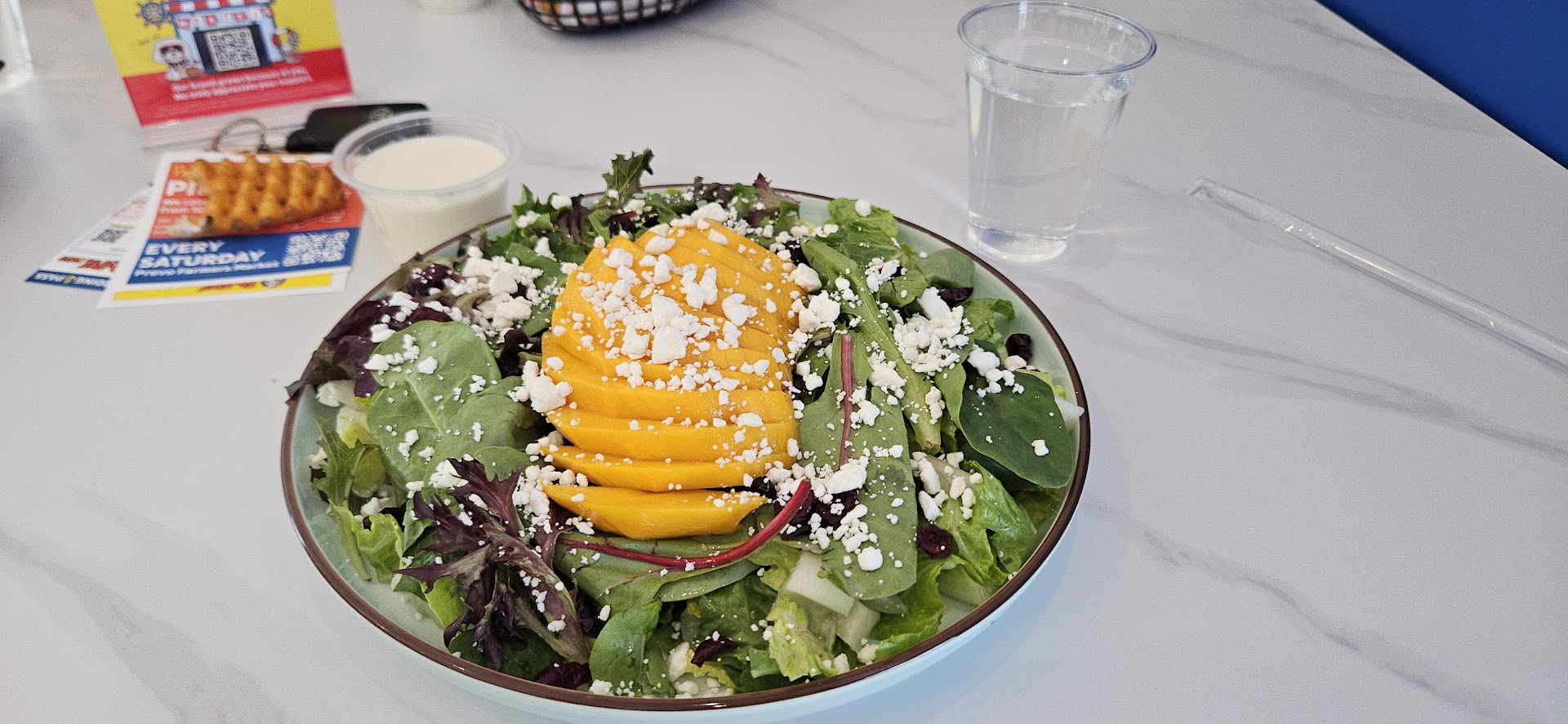 We ordered the mango salad, was great! Fresh, crisp greens, mango was sweet and perfectly ripe. Had craisins and feta or blue cheese crumbles. I maybe expected some red onions? Or maybe even soon candied or chopped nuts or pecans. On a typical mixed green fruit salad. It was still delicious!! I really enjoyed the pineapple dressing (got on the side to control amount= perfect)!
