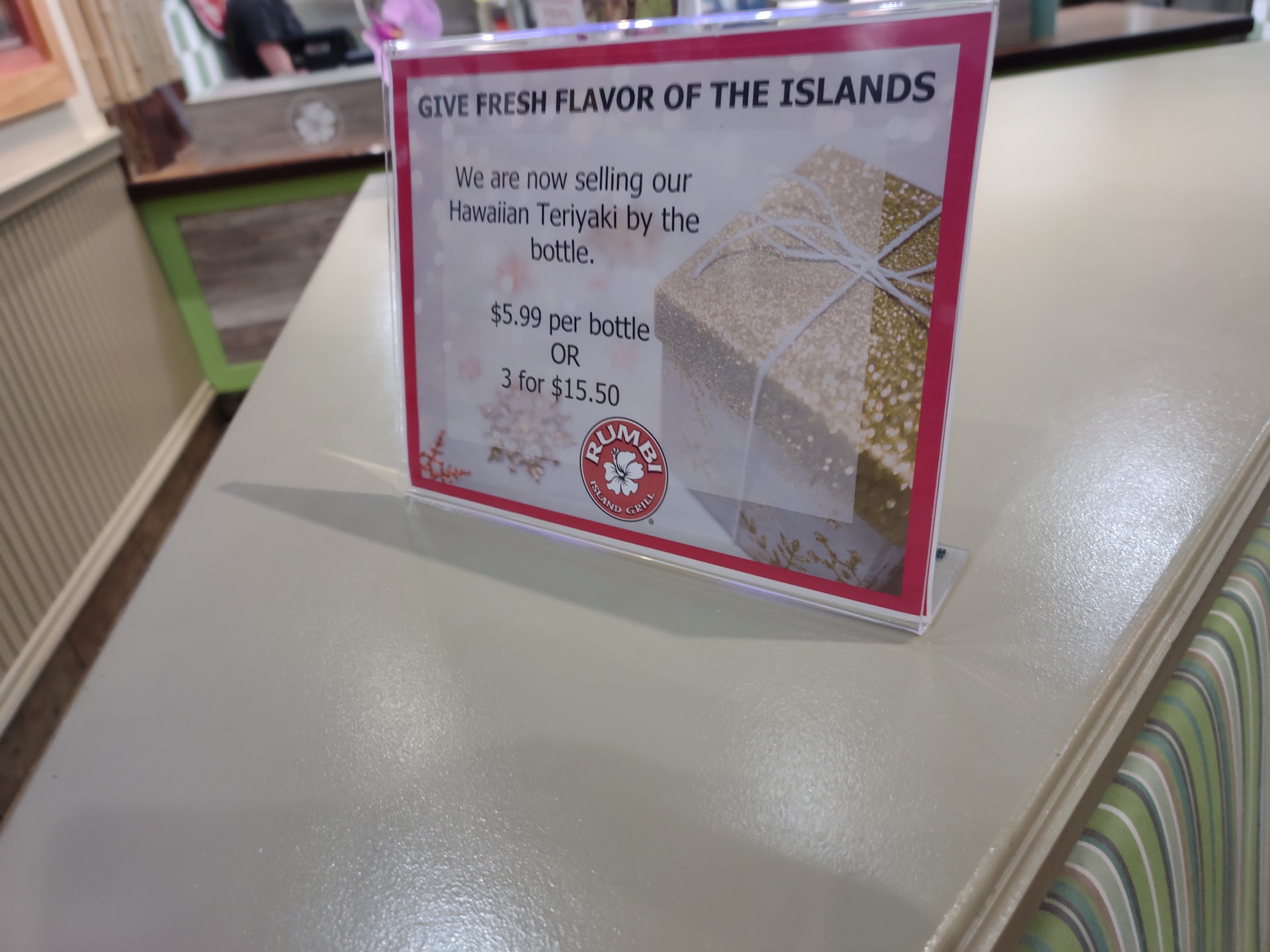 It's fast food..but good fast food. We have been there a number of times and since I've liked it a lot every time we've bee there, I'm posting about it. We went there again last night and instead of getting traditional Island fare which I've always loved, I decided to go with an old fashioned hamburger. $5.99. It was huge! And delicious. I got sweet potato curly fries with it and it was great. It had a little pineapple and teriyaki sauce under the bacon it so I suppose the burger still had an island flair. Many places we go to eat at 5pm on a weekday (and sometimes on a weekend) are deserted. Not Rumbi. There seems to always be people there which tells me they'll probably be around a while. You pay up front but they don't have a place on the receipt to beg for an advance tip nor do they have a tip jar on the counter which is a big plus for me (one of my pet peeves), even though they do deliver the food and clean up the table....give a tip only if you want to! Oh..and if you are tired of getting diet coke or pepsi as the only diet drink option in fancy restaurants, Rumbi also has two flavors of uncarbonated, uncaffeinated Chrystal Lite to choose from. It doesn't have the atmosphere for an anniversary dinner, but it's nice for a Hawaiian fast food place and the staff is always friendly at the Lehi Utah location...