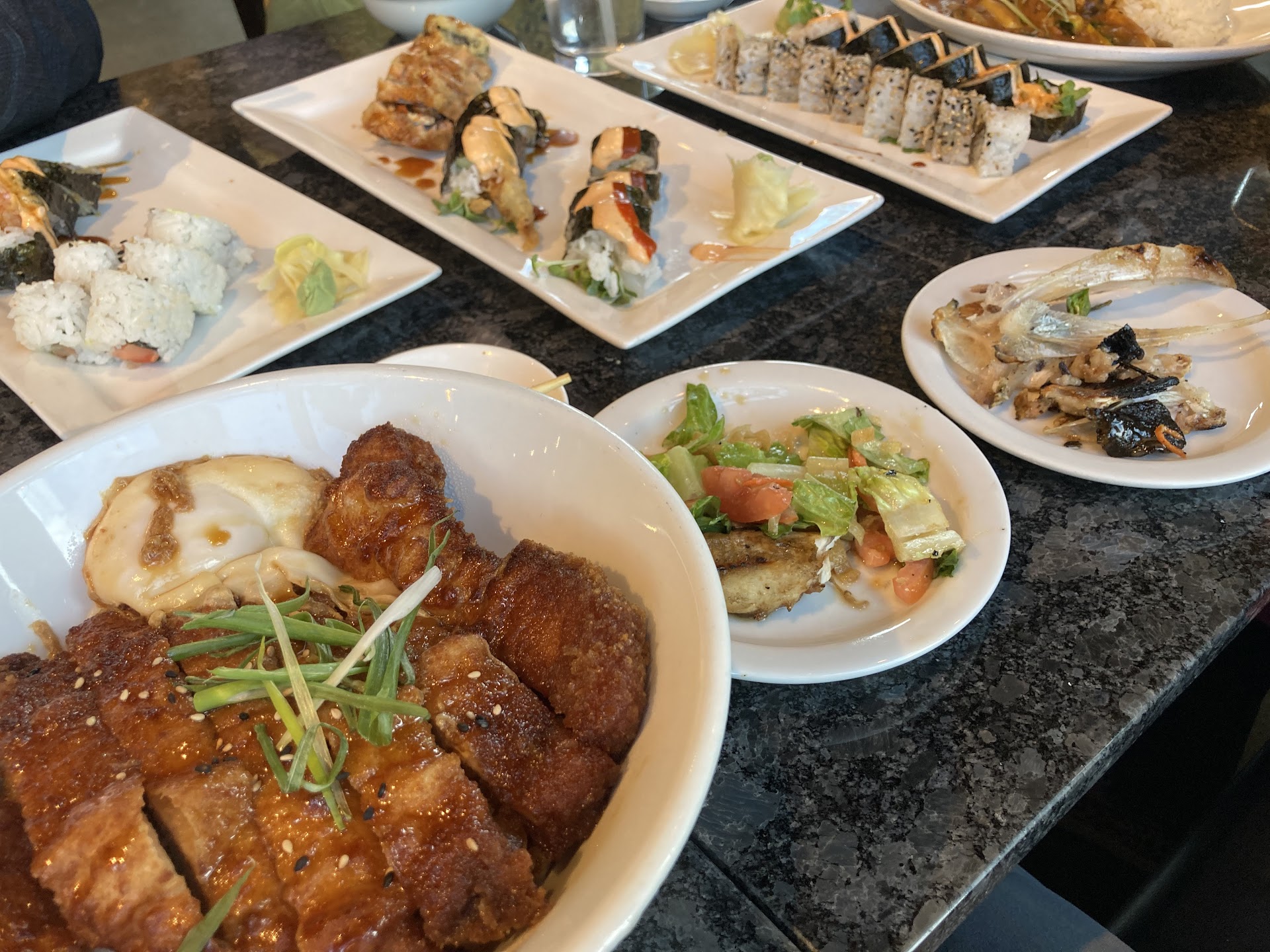 We ordered a bunch of their lunch specials, about half of them were the sushi lunches, with two hot dishes: The tonkatsu (the breaded pork cutlet over rice) was served in a large bowl, with a large and delicious portion — the coddled egg and extra barbecue sauce were excellent (see the photo); and The Japanese yellow curry vegetables with rice, which was very good (and smoky; the curry could have been a little looser and saucier, i reckon) Overall, the sushi was very good (see the photo).