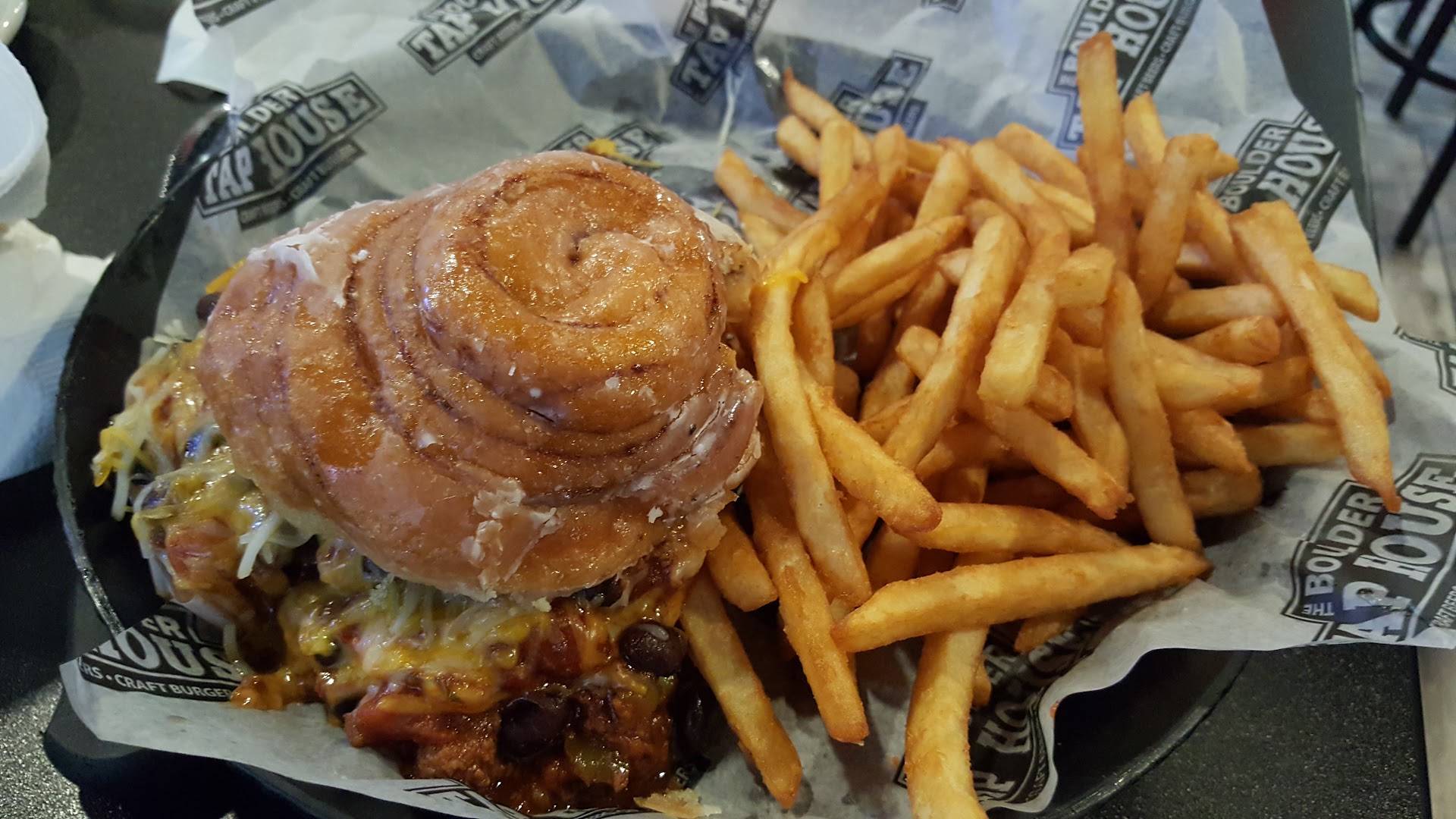 Read moreVisited The Boulder Taphouse today for lunch. Gobs of tvs all around the walls, plenty of windows to see out of, very bright. Bartender started us out with country music at 130 db, then finally decided on the Cubs game at a lower volume. The booths have fixed tables which made a tight fit, so we opted to move to a high table, whiched rocked back and forth. The bathrooms were clean and nice. Free wifi, no bike racks, dont deliver or cater. They use my town 2.0 Service was excellent, waitress was very friendly, motivated, said she loves working there and her job. Tried the Sweet Jerk wings which were some of the best I've ever had, crunchy outside, juicy inside, more sweet than heat, better than places that specialize in wings, imho... Followed that up with the Defibrillator burger, at 15 bux what a burger! I'am thinking it was developed to combat the Emmenecker burger at Jethro's, two half pound burgers, 4 slices of bacon, uncounted slices of Cheese, pickles, jalapenos, thousand island dressing, lettuce, onions, and on top were two two inch deep fried cheeder cheese blocks, all in the burger was pretty good, decided to attack it with fork, doubt i'd get again, its a chore! Overall a very good visit, would reccomend! 2nd visit today. It was fairly busy at noon, had the spicy garlic boneless wings, not bad, they were garlicky though not much spice to them. Also tried the Jalapeno Popper burger which came with Frenchs onion rings on top. Mine had the Jalapeno taste going on, with the heat going, but I think didn't get salted when cooked, which helps with the taste. Was still juicy when it got to me, I did notice a couple of pink spots in the burger though. The jalapeno fries are just the fries with grated jalapeno on them, not bad though... overall came out to $30 with tip. Still fast...