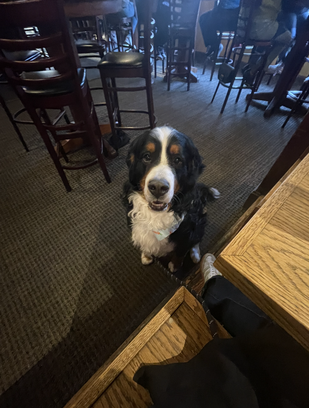 My dog, wearing a red service harness, walked in calmly and settled beside our table. The surrounding patrons adored him. The high-tops beside us and the booth behind us had no complaints. He was well-behaved, taking treats like a gentleman and adored by everyone near.