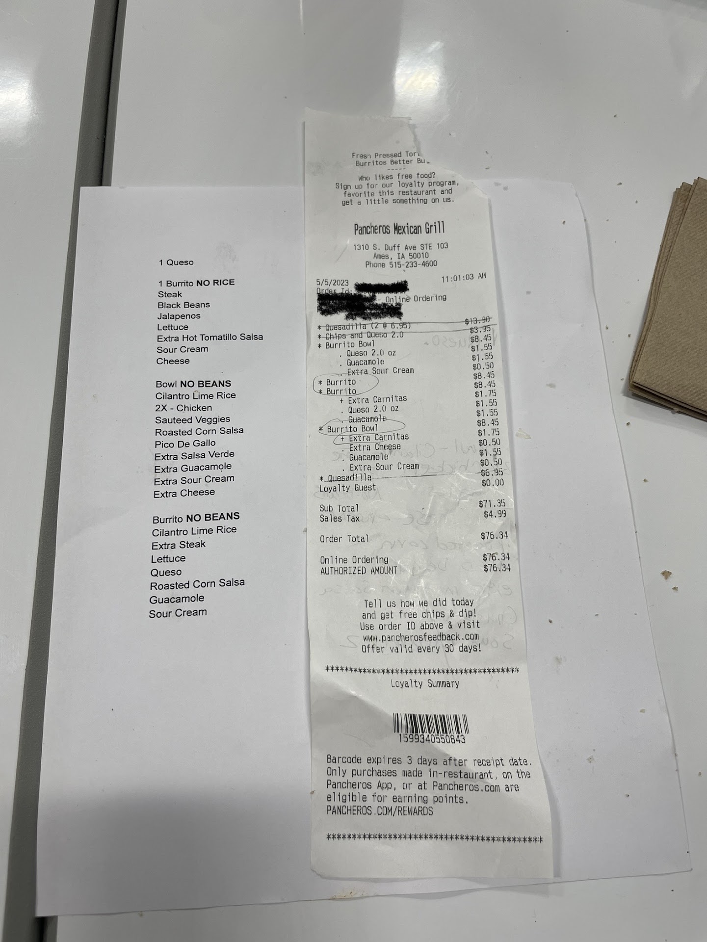 Read moreA group of us ordered online and spent over $70.00. I went and picked up the order and brought it back to work, and right away my coworkers new it was not enough food. When we called and asked where are food was, Pancheros manager said “we don’t have carnitas”. The manager then said “the Door Dash driver was supposed to call”. Funny thing, I’m not a Door Dash driver, we ordered online for pickup. Then they said there was no phone number, the phone number was on the receipt (blacked out in the picture). The manager said to write down what we missed. In the picture you can see what they missed. When I went back to Pancheros, I handed them the list of food they forgot to make, and I asked “so, you charged us full price then did not send all the food”. The manager said “We were confused and it was crazy”. They messed up the order with me standing right there and when I went over to help them read the ingredients to each dish, I noticed they had carnitas 🙄 I will never order from the Ames...