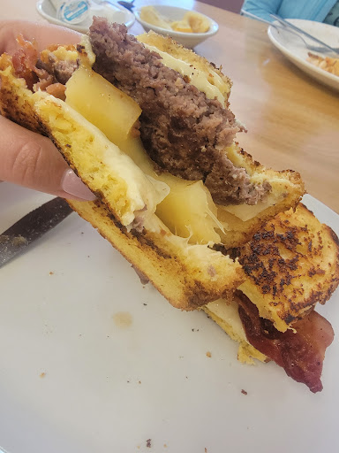 I have been here before and have always had a pleasant experience. I was excited to bring my mom there who was visiting from out of state and hyped up how good the food and everything was there. We sat down with 2 other tables of two people. Literally the smallest crowd I've seen in there for breakfast. Our young blonde server was slow and was too busy chatting with one other table of young girls. Anytime we needed her, my mom had to wave her down. My mom asked her 3 times for lemon in her water whicih was pretty simple. Silverware was not made available to us until after food was served and she never came back to check on us at all to ask how the food was, again, unless we waved her over. I ordered the Hawaiian sandwich which was featured on thick toast with pineapple, bacon, a burger patty, cheese and tomato. My mom ordered the sticky bun sandwich with egg, sausage and cheese on a sticky bun and we chose to share half of each. Her sticky bun sandwich was great. My sandwich came with not a piece of pineapple and one ridiculous piece of bacon. When I realized there was no pineapple, I called her over. She asked, would you like me to bring the pineapple to you or make a new sandwich. I said I'd like a sandwich since that is what I ordered. She brought it back, this time correct, and it was one silly ring of pineapple. I couldn't believe it. I thought the sandwich was absolutely pitiful and the server was somewhere in the clouds the whole time. I won't be back and I won't embarrass myself by taking anyone else there again. Such a shame because it used to be a...