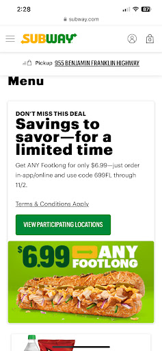 Read moreHaven’t been to Subway in like 2 years so we decided to give it a try and were disappointed. Went online ahead of time to view the menu, saw they were participating in the $6.99/ea foot long promo. Went in to order, was told by the woman working that they’re not participating in it. Opted for their “BOGO” which only included 5 specific sandwich options. Ordered the tuna and the meatball subs. Meatball sub had probably 9 tiny meatballs on the entire thing. They no longer sell the 9 grain honey oat bread. They no longer have mozzarella cheese, or sweet peppers. The options were limited, overpriced, and the end results were totally...