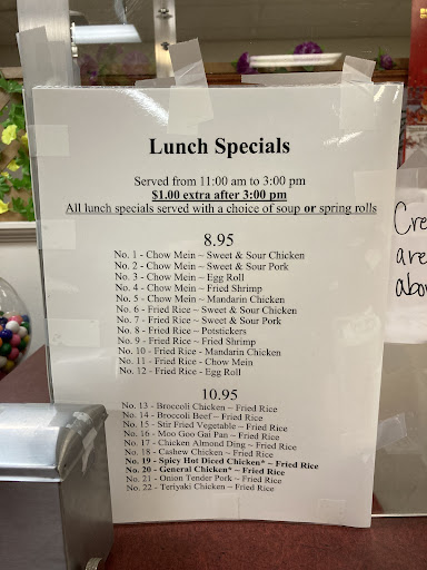 The Pork fried rice was literally steamed white rice w/bits of pork, a small amount of scrambled egg, and some green onion. Absolutely NO flavor. The beef w/broccoli also fell flat, with little savory flavor. The chicken chow mein just wasn’t! I’m not sure what it was…it was not like any chow mein I have ever had…it had those short, hard & crunchy noodles (like La Choy brand in a bag), with a brown sauce, carrots, bamboo shoots, onion & celery bits. This dish was the most savory one of them all, but was missing the typical chow mein noodles. I noticed that the waitress brought out a huge plate of chow mein noodles to another customer, so perhaps she misunderstood what we ordered. The lemon chicken and sesame chicken dishes were identical: both had a sweet glaze sauce over crispy coated chicken. No difference in taste. The only difference between the two dishes, was that the “lemon” chicken had slices of lemon on top.
