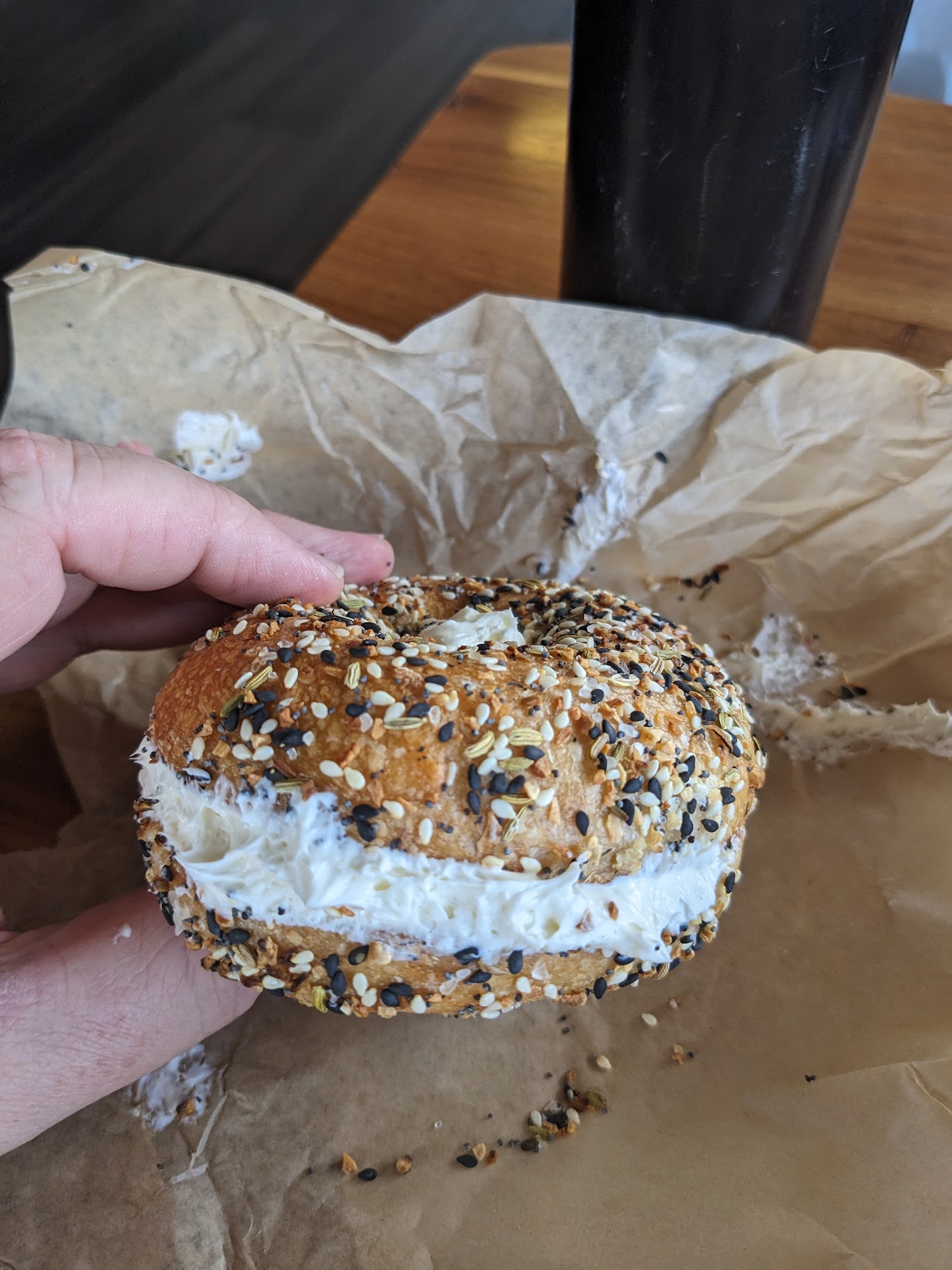 Cannot speak on the bagels as I got gluten free, which was an additional $2.00 for a store-bought bagel that they do not make (employee noted they were store bought). However, there were a few health/cleanliness concerns. First, the bagels are sitting in open wire baskets on the counter with a ceiling fan above it. They allow dogs inside the establishment, which I believe is a violation since they are preparing food. A customer had their long-haired, large dog laying on the floor, with many ceiling fans circulating, which could land dog hair on the exposed bagels... The customer did ask if it was dog friendly inside and the employee said it was and it was not a service dog.