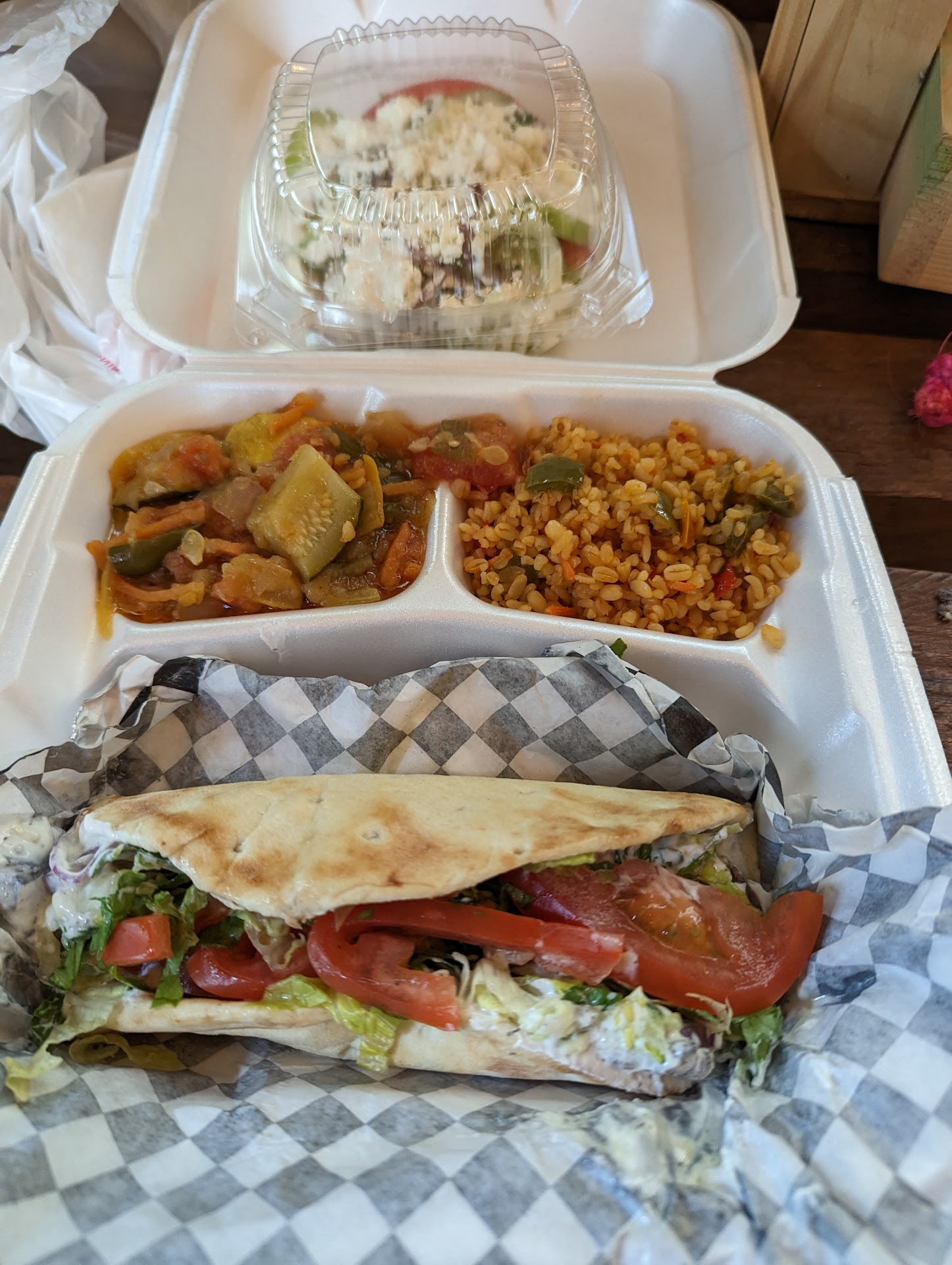 Oh no! So the “Turkish style thinly sliced beef” turned out to be three slabs of formed & processed gyro meat, as was the machine perforated pita. The bulgher wheat is made with canned tomatoes & no detectable seasonings other than a little cayenne. The Ratatouille is starchy, also no seasoning detectable. Salad is shredded lettuce and a bit of carrot & onion with small portion of a feta dressing. I had an pretty good short Turkish coffee, included a nice piece of Turkish delight. I ordered two pieces of baklava, factory made and soggy. This all cost $31.59, I added a 15% tip. After trying to order from here all week, the cart has been closing earlier than the 6:pm stated on the sign. I feel like giving the owner two stars because he was very nice. But the food is awful low grade processed and boxed Gyro meat. Takeout being sold for the price of a handmade meal at a restaurant on a creek in the nice part of...