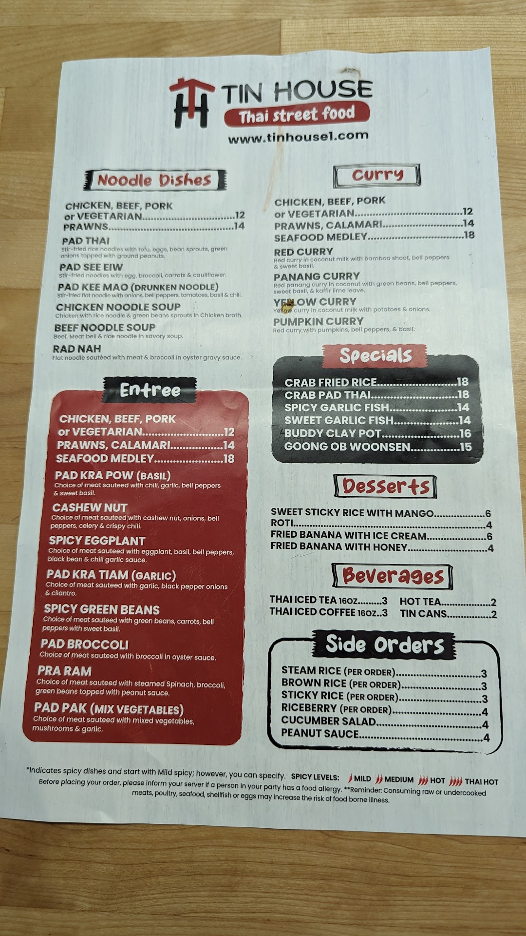From the beast to something beautiful Taking a ride through town one day, noticing newer banners upon an old restaurant, from there I thought i'd cut my Sunday drive short and investigate. After seeing all of the newer renovations on the outside of the old Thai restaurant seeing the open sign in the window was a nice welcome sign. As some one living in town long enough to think that the powers that be would have torn the building down to make way for some new stylish 20th century box with no real class, personally I seen a rose finally blossoming into what I had hoped to be a nice place to take family and friends. What I could only imagine was the owner or a bus boy pop there head out to greet me before I ever disembarked my vehicle. " Hello there I hope your hungry." the gentleman said. "I sure am, so your all ready and open for business?" I replied, "Indeed it is, but its a soft opening, so we can see how things roll in town and what the people like." A soft opening, I thought, that is a great time and place to take the family and see what they think of Thai food. "Then I'll be right back, I've gotta go grab the family, they'll love this." we said our piece and I was back within 15 minutes with the lady that married me and our kid to give the new Tin House a try! We were not in the littlest bit disappointed! Walking into the restaurant seeing the beautiful semi open kitchen with the bar and new floors that looked like anyone could eat off I started scanning to the back of the house trying to see if we would set at the bar or if there was enough seating for 3 or 4 people. There were a few guests there with white plates full of vibrant colors, meat and even noodles! After the gentleman told us about the menu and drinks he had directed us to a very nice window seat. passing by the open waitress stand and a few guests I had asked what they would advise for a few meat eaters and liked a little heat in the mix. The gentleman asked what type of food did you have in the last Thai restaurant that was here? The first time I tried the curry was in college and with the old Thai restaurant having similar types I asked for the yellow curry with chicken so we could try there flavor of curry they had. Our child wasn't very hungry, but being a young growing person we just knew the hunger bug would come when our food did. We went with a nice appetizer of satay chicken with a very nice peanut sauce. Now my wife is a little more eclectic when it comes to trying out new places for food, and this place was some what a new born off and running! Not being able to interpret all the words we looked into what the dish actually provided, before I could suggest anything for her, she came out of her shell with such a large "lets see what a PAD SEE EIW is like." Such a large voice for a small lady, I was even caught off guard, and as almost every one close to us seemed to peer in her general direction the gentleman broke the split second silence with an equally large voice of "What type of meat would you each prefer?" Like an out of tune quire, the three of us almost sang out the words "chicken please!" looking and laughing the gentleman said "i'll be right back with your drinks." As we chatted my wife and child had asked about the wonderful smells that had seemed to be coming from every where but were most prevalent around the front of the house. As they were discussing the wonderful smells the gentleman seemed to pop out of no where with a couple hand fulls of steaming plates! Noticing the vibrant colors on each plate, including a plate full of satay chicken (chicken kabobs basted in something Delicious) with the peanut sauce that my wife said smelled like heaven and the kid started in on, it seemed as though they inhaled it! As the gentleman spoke about each dish, we would each have our first bites I noticed just how much my wife and child seemed to love what ever it was the gentleman had put in front of them. As they began to eat the food seemed to disappear from the plates almost quicker than even I expected. I think he knew...