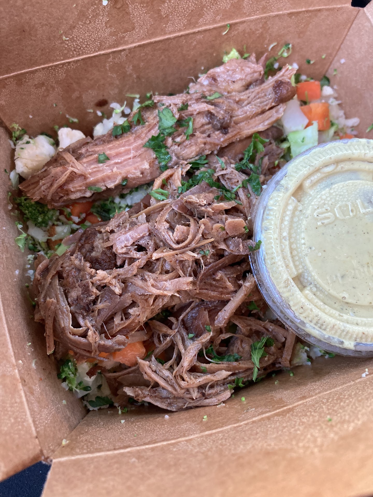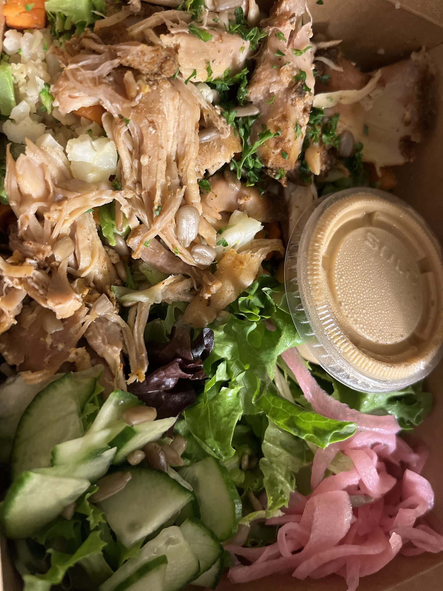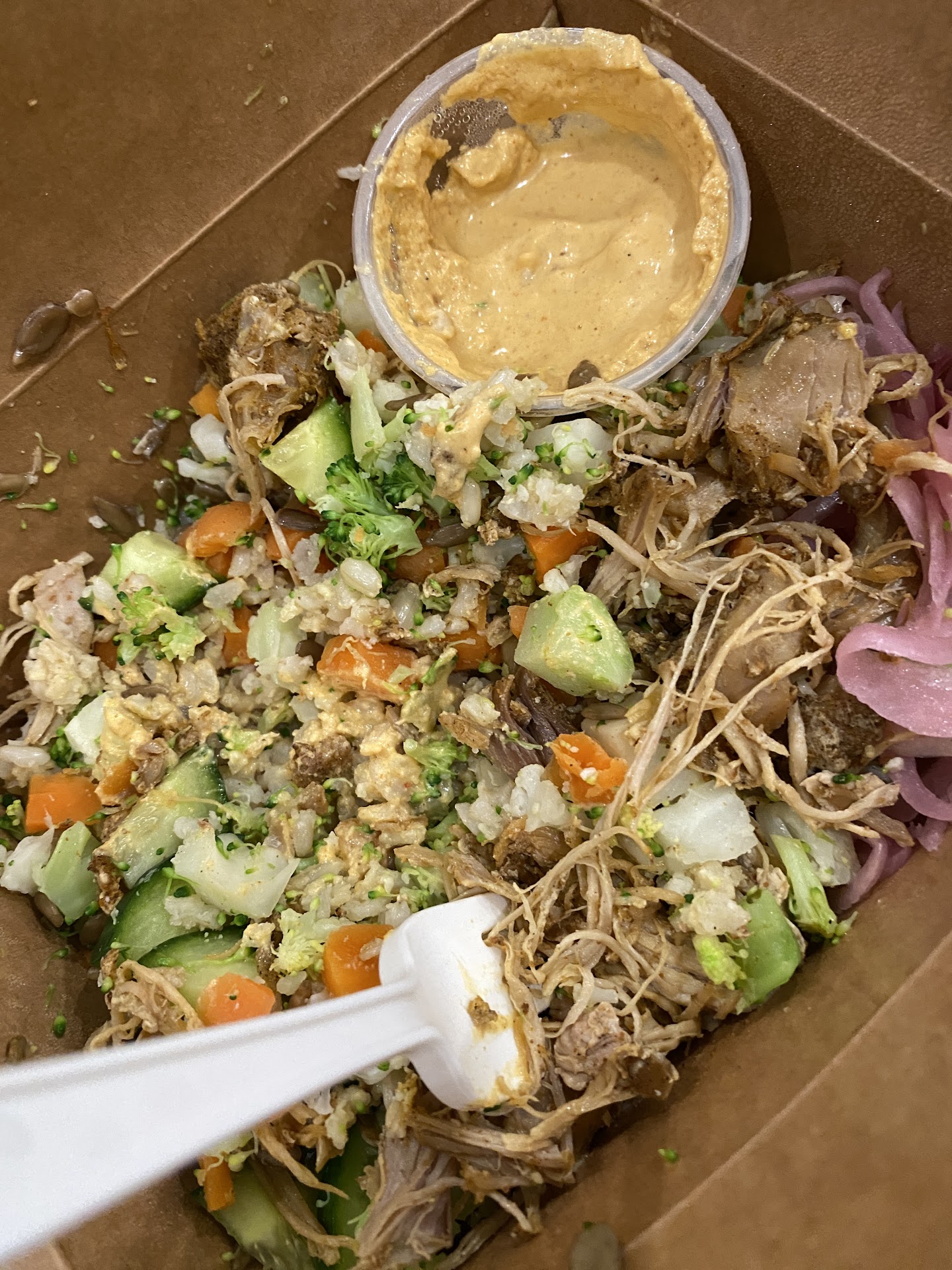 Wowzers! What a tasty meal! It was very late evening and I wanted something quick while also healthy, and this absolutely exceeded those expectations! The Chicken Mixed Bowl had good flavor and everything was fresh, except the avocado (extra charge, it was too ripe). I'm glad I got a side of Slow Roasted Pork Shoulder as the chicken in the bowl was a pretty small portion. I got all the sauces to try but I ended up just sticking with the green one as it had the best flavor with a hint of lime/citrus. The veggies in the bowl and the side surprising had a crunch too, it wasn't just kush. Would absolutely...