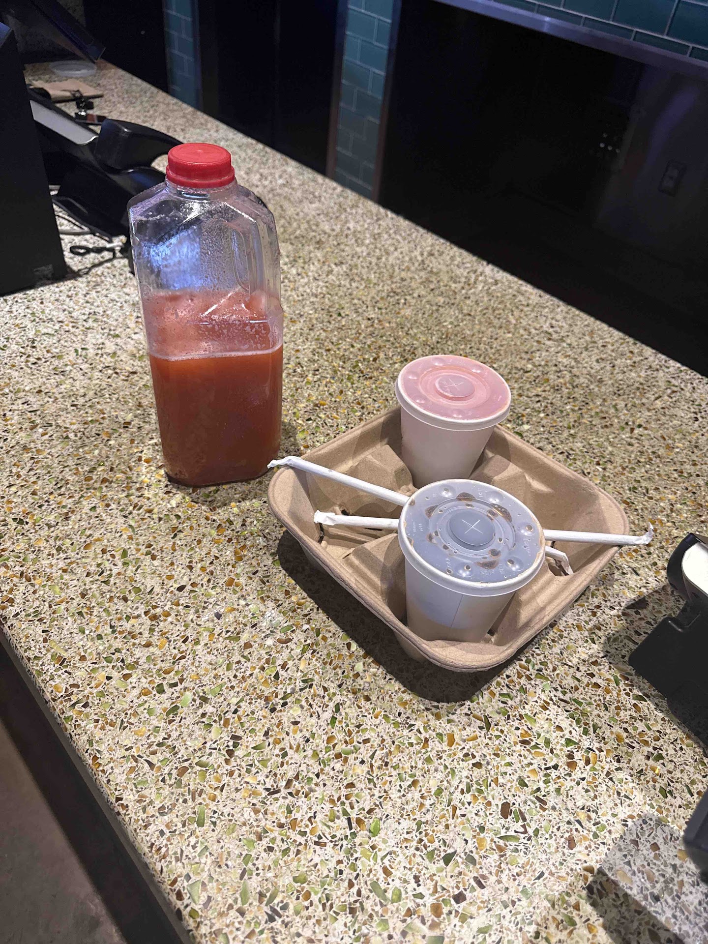My boyfriend and I went there for dinner last Saturday night and after being seated we waited several minutes before being given menus. Our waitress took our order and brought us two pink Cadillacs Instead of two Cadillac margaritas and two shots of tequila without limes. She completely forgot my boyfriends beer and when we asked her for it she told us we could only order one drink at a time and would have to ask a manager if if was permissible to bring him his beer. We finally received our drinks and the waitress went to another table and took another food order before ours and spent 10 minutes at the table taking the order. By this time our drinks were empty and we still had not ordered. We then finally got the opportunity to order some calamari and buffalo chicken wings. The calamari came out within 5 minutes and was cold and rubbery. The waitress did not bring us any plates and we had to ask for those. The chicken wings came out and they were undercooked we believe because we didn’t feel well that evening after we left the restaurant. The only saving grace was that the drinks tho put in wrong we’re delicious and we did finally get our Cadillac margaritas which was very good! We normally love BJs and were so disappointed in the food and the service we received on this not so busy...