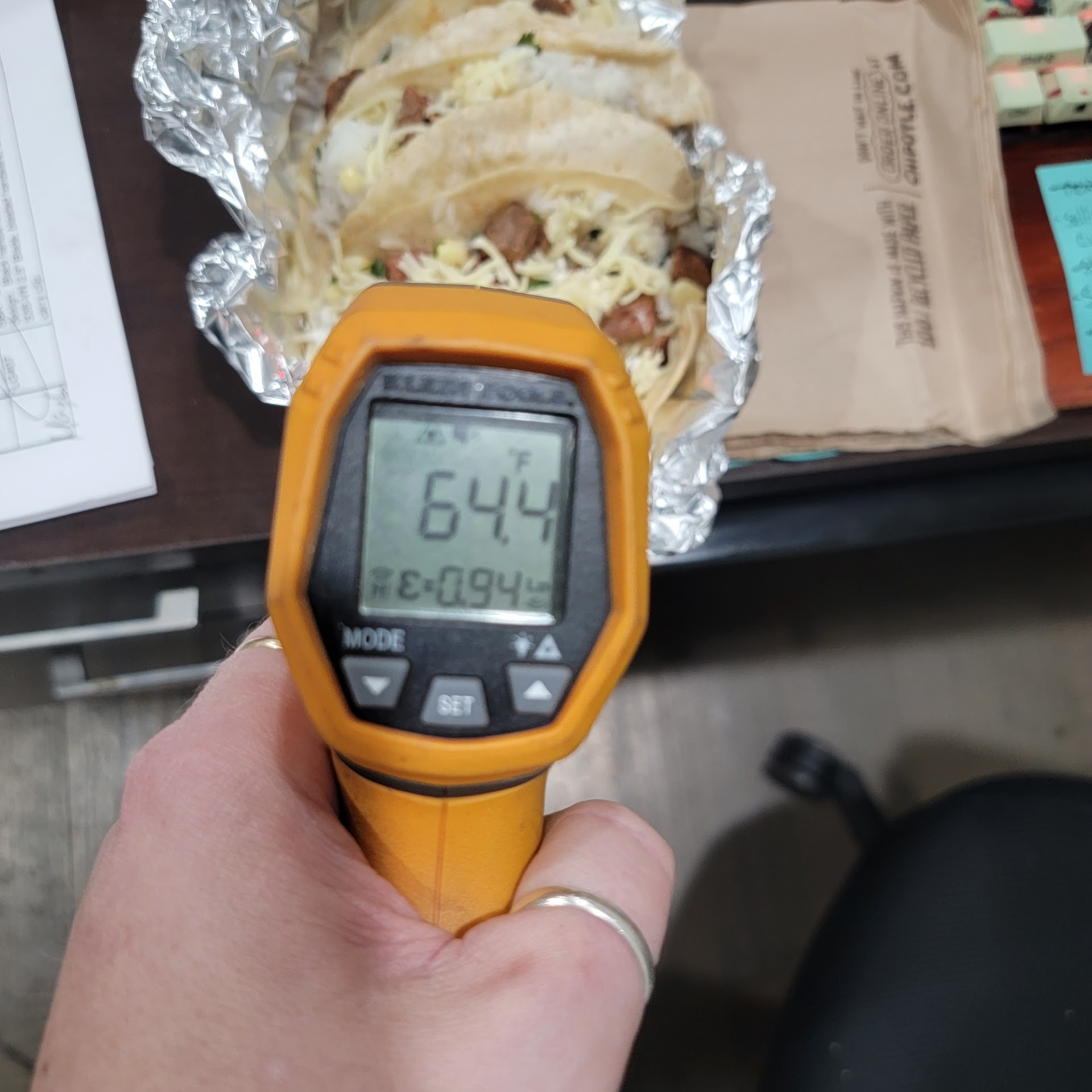 You can't spell "Chipotle" without "E. Coli." Thus restaurant has the uncanny ability to make food that is colder than room temperature. You are seeing my photo correctly, my food is 64.4 degrees Fahrenheit. It's hotter outside than my food. So if Chipotle is wondering why so many people get sick at their restaurants, this would be why. Not only is this utterly illegal, but not safe. Hot food should be a MINIMUM of 135 degrees. That's more than double how hot my food is. Before you say "maybe it cooled off," I bought this food, immediately wrapped it in two jackets, & drove a whole 5min back to the office. So it should at least be warmer than a dead body. The temperature reading is also on the rice & steak, not the colder items (which should still be at least room temperature). This location is a mess. Inconsistent, always cold food, & items constantly out of stock. Even now, they advertise Carne Asada on this very page, yet do not serve it at this location. Everything about this spot is janky. Chipotle corporate seriously needs to make some changes, before they end up making another few hundred people sick with their terrible & illegal serving of food not held to proper safe temperatures. I tried reporting this to Chipotle corporate, and even their garbage website doesn't work. They likely have so many complaints that they just make a contact page that never sends anything to fool customers into feeling...