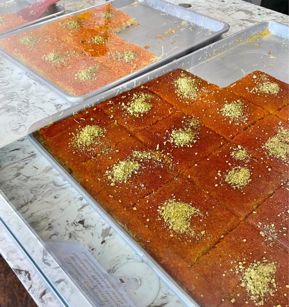 At Knafeh Cafe, knafeh can be made to order in a personal-sized pan for $12, piping hot. Or, it can be purchased by the slice for $5.75. I was lucky enough to arrive when the knafeh na'ameh (soft) was freshly cooked. Wanting to try both the soft & khishneh (crunchy) iterations, I waited 10 minutes for the crunchy version to be ready.