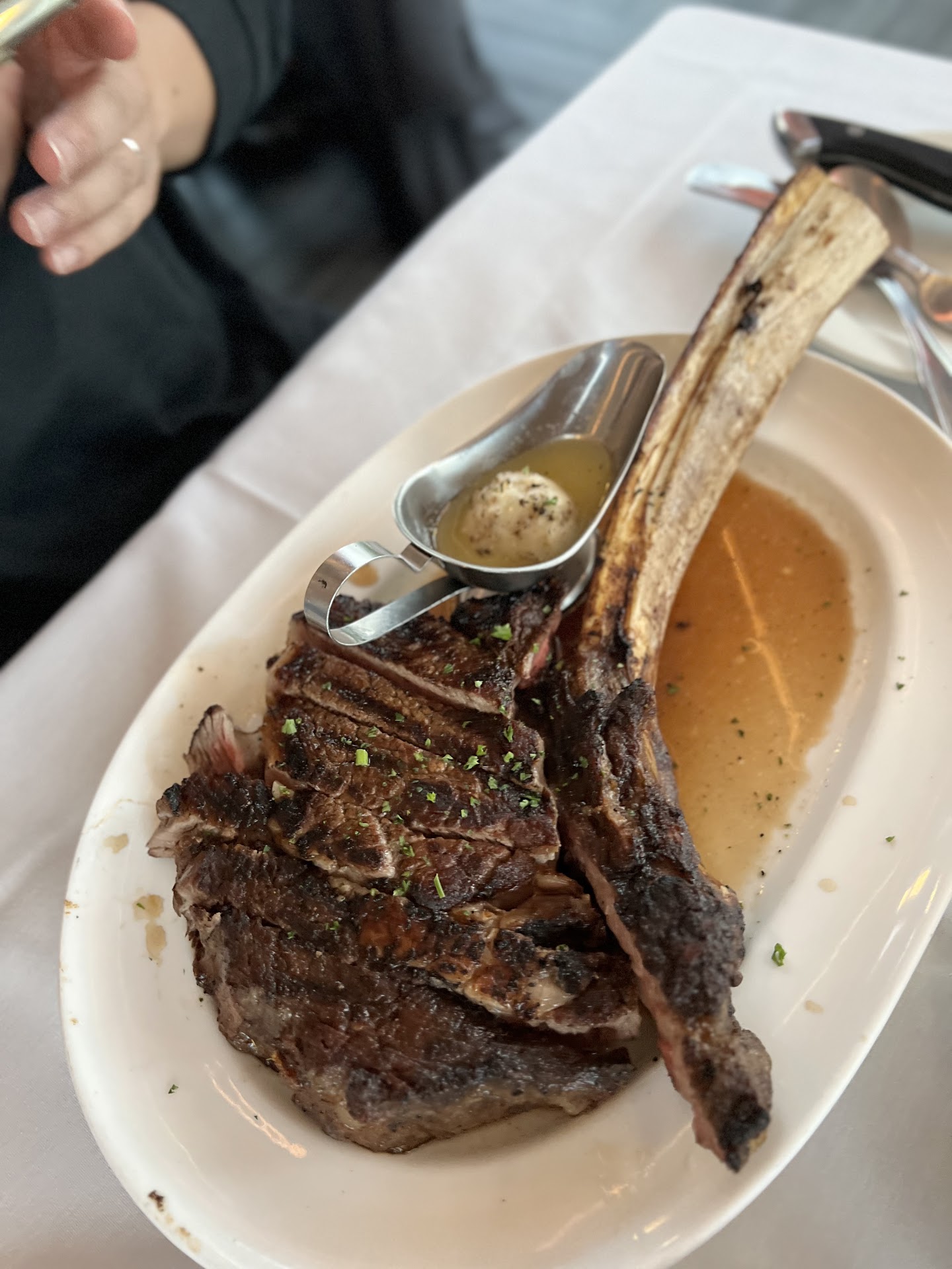 Then when he took our order, he didnât write anything down. I ordered a New York medium and my partner ordered a dry age medium rare. When a different server brought us the food, they gave the New York to my partner and the dry age to me. We then tell them that they needed to switch the steaks and the server looked confused. After we switched and the server left, we realized they made the New York medium rare and the dry age medium. We werenât surprised tho since Nick didnât write our order down, he obviously put it in wrong. The steak itself tasted like it wasnât even seasoned. Very bland, tasted like they just cooked it in a bunch of butter and sent it out no seasonings or anything. I was just trying to power through my meal so I could get out of there. It was horrible.