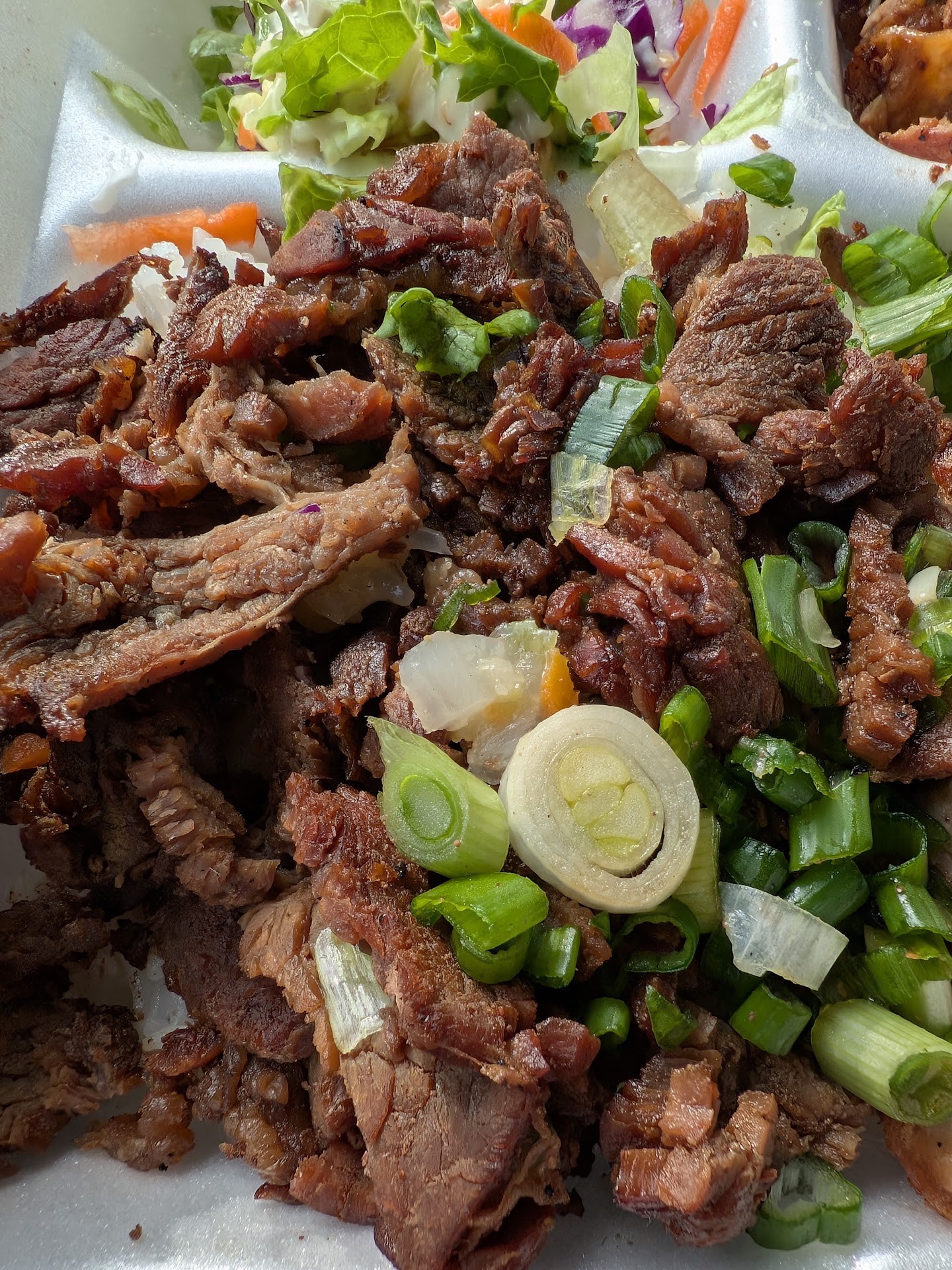 On my last visit, I ordered a Teriyaki Beef and Shrimp plate through the drive-thru. When I got home, I saw that it was the Chicken and Shrimp plate. I was really craving the beef, but when I checked the receipt, they charged me for the chicken. So, they must not have heard me correctly. The chicken and shrimp were still pretty good; the chicken was tender and seasoned well, and the shrimp was nice and crunchy. The included egg roll and gyoza were average, but I could tell they had been sitting out for a while. The salad was good, with plenty of dressing.