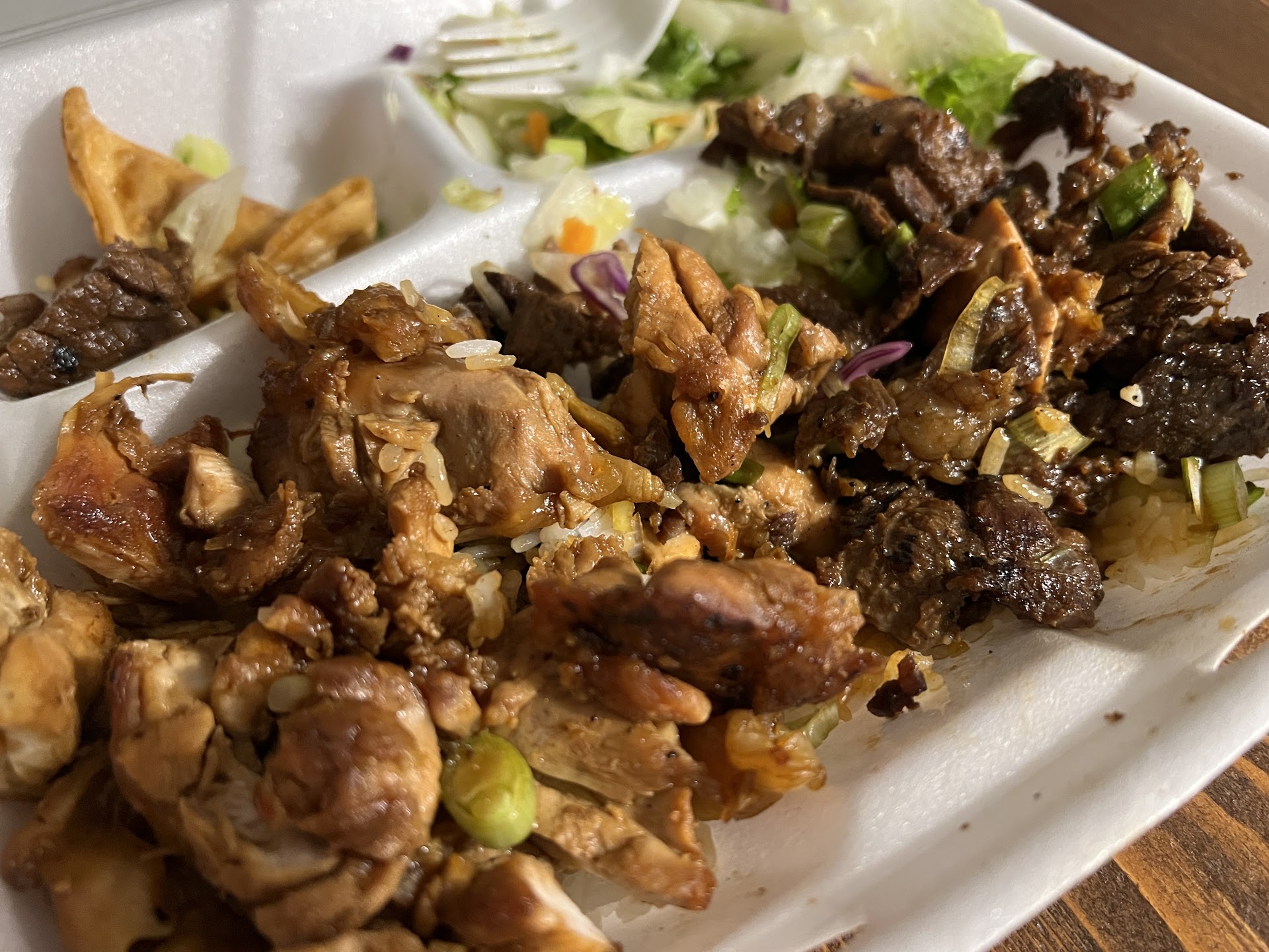 I finally got the chance to check this place out last night and I think my fellow Yelpers may have overhyped it just a tad. The food is definitely good, but I was expecting the Ferrari of chicken/beef bowl places for some reason. I ordered the beef and chicken combination plate which I thought that would be a good start especially from the other recommendations on Yelp. It came with a side salad, 1 veggie eggroll and 1 gyoza (chicken?) and two little cups of their teriyaki sauce. Not bad for a little over $13! Definitely could've used more sauce though and probably a few more scoops of green onions too. Most of the beef pieces were tender and flavorful but I did have a few chewy pieces. The chicken skin took a little getting used to but it wasn't bad. There are plenty of outdoor seating even at dinner time.