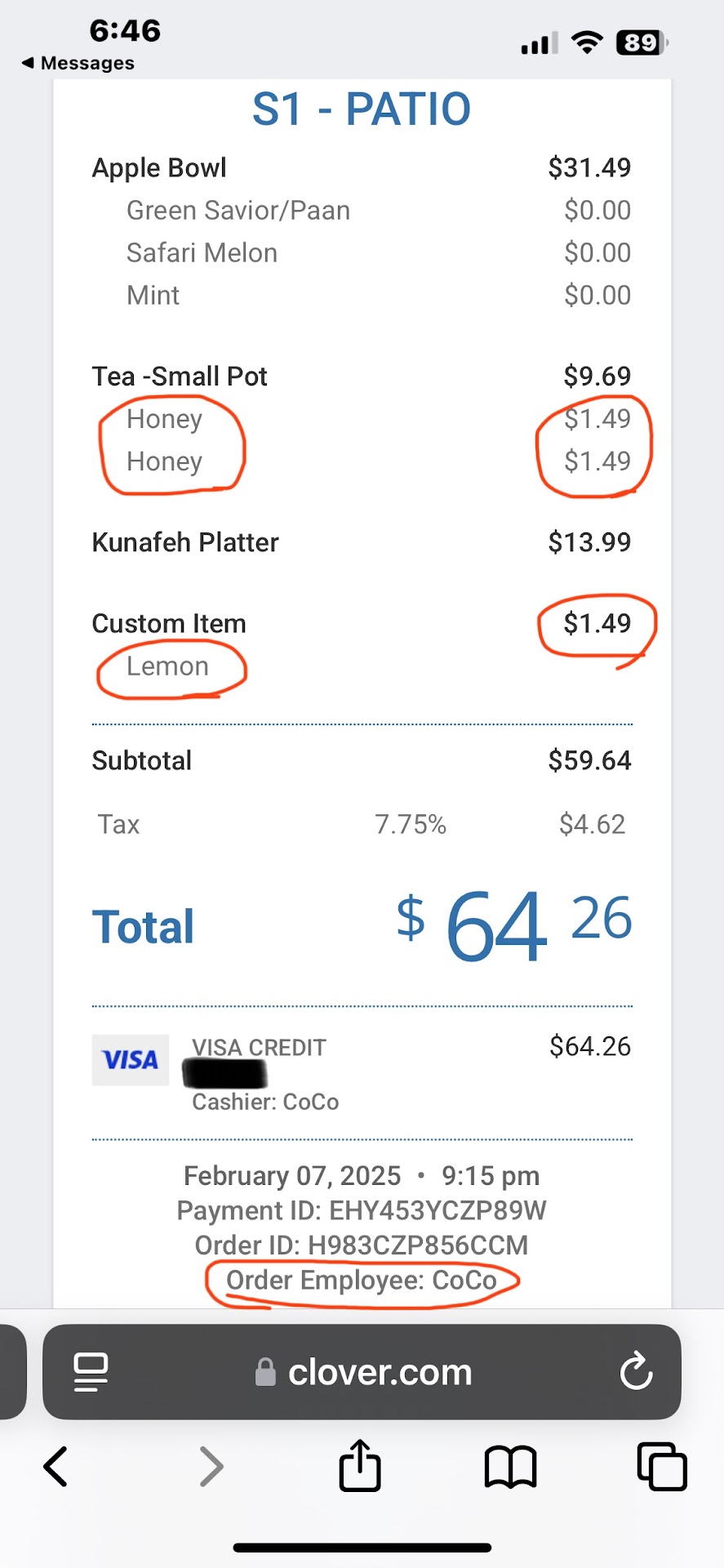 This was never mentioned upfront, nor did we request additional honey or lemon beyond what should reasonably come with the tea. The cashier, CoCo, deliberately added extra charges, inflating the bill unnecessarily.