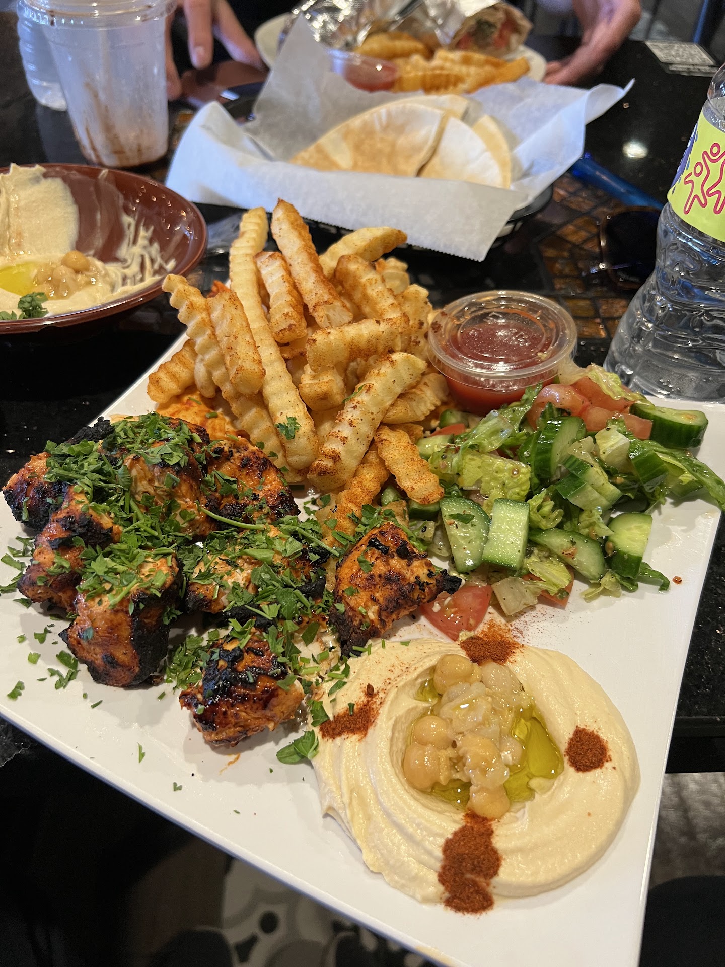 Read moreEnvironment is kinda nice and in fairly good shape. Lots of tile everywhere that's the same.. benches and tables made from the same tile (must have been a bulk discount) Some of it is cracked on the table. Lots of fake plants inside. Overall, decent for a hookah place but also overpriced. I ordered a coke, (3.79) and we got can with a straw. No glass, no ice. Ice tea comes in a truck stop foam cup and 2 tea bags. ($5.00) Ordered a hookah...They automatically upgrade you to an apple bowl for an extra 7 bucks. Total $26 for a hookah with a disposable hose. Chicken kabob was tasty but a little burt. .there was live music and it was busy, so we had to wait about 20-25 min for hummus and a chicken wrap. At the end when you pay your bill the server brings the payment machine and stares at you to see how much tip will be added....