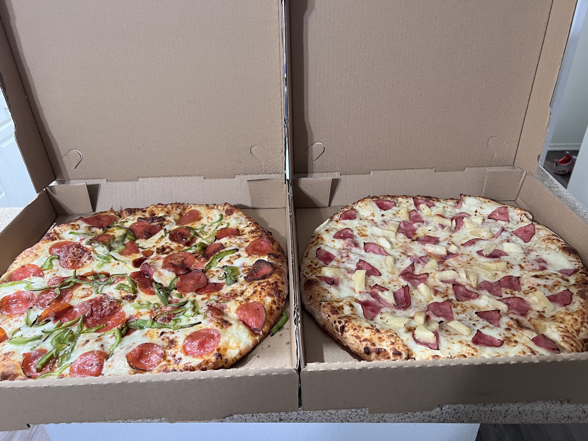 OH EM GEE, the crust itself was a game changer! We got a plain cheese pizza for the kids ans pepperoni and jalapeño for the adults. Due to us living 15in away, having to put away a weeks worth of groceries....it was a bit cold by the time we ate.