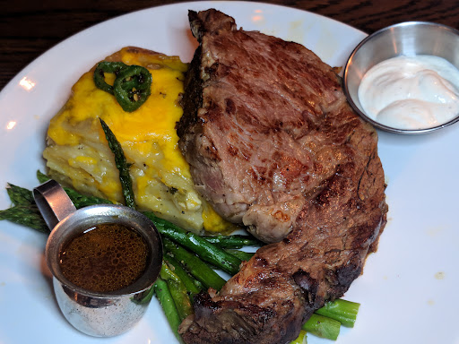 Oven Roasted Prime Rib (medium well) was actually a much more generous portion than I thought it would be. Nice to see that since it's usually higher prices with smaller portions I've been experiencing. The grilled asparagus were perfectly cooked & just as the short ribs entree, the veggie component really stood out. The cheddar jalapeno scalloped potatoes is basically layered (like lasagna) scalloped potatoes with 2 jalapenos on top. I thought the jalapeno was going to actually be incorporated with the cheese & throughout the potatoes. The potatoes are cooked well, for such a thick stack but since no there's so much potatoes it really needed more jalapeno & cheese flavor. I like how the prime rib was mainly actual meat (not fat) & they got the temp right. It's very subtlely seasoned & I feel could use somewhat more aggressive seasoning & a crust since it's such a thick cut of red meat. Wasn't as tender as I've had at say Lawry's, but not terrible either.