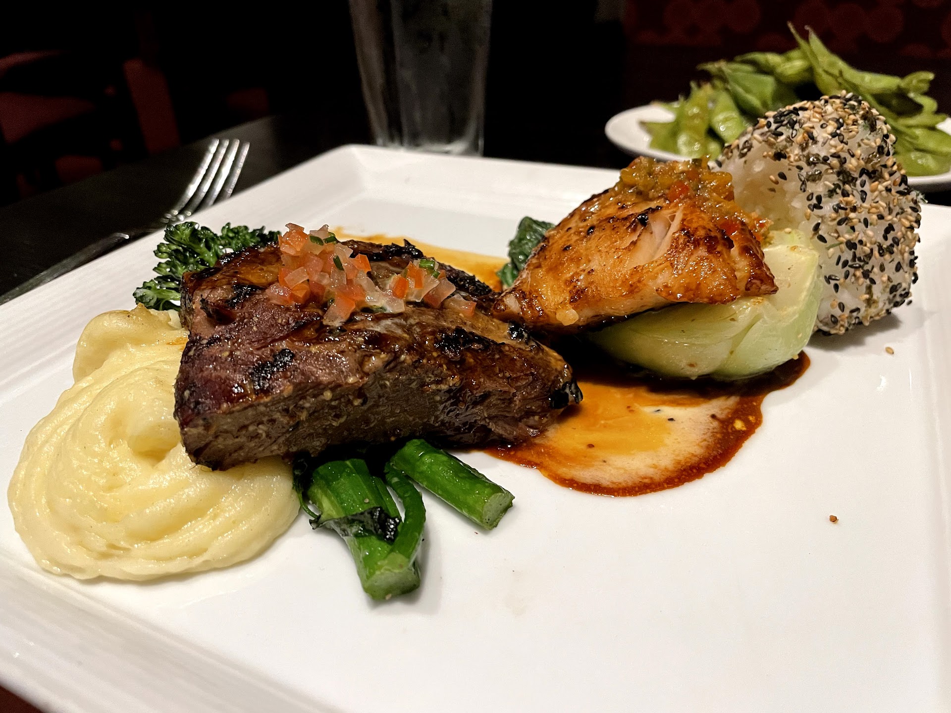 For the next course, I ordered the filet mignon, medium, with lump crab cake and added a lobster tail (the dish comes only with the crab cake and filet) and my wife had the Chilean Sea bass (one of her go-to dishes when it's available). My steak was cooked perfectly, with just the right amount of pink in the center with a good char on the outside. The lobster tail was juicy and not overcooked (unlike Hell's kitchen... SMH). The lump crab cake was free of shell pieces and not overly salty nor overly breaded. The Yukon mashed potatoes, like the bisque, was velvety smooth, with a hint of butter and natural potato flavors. The asparagus was excellent as well as the truffle onion and misoyaki demi-glace.
