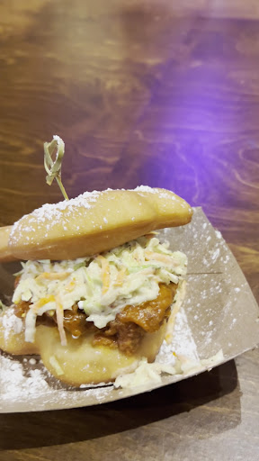 Food: I love Royal Street in the morning, evening, and even at supper time! I have been here for morning monte cristos and seasonal cold brews and for quick fritter bites in the evening, because this stand has a revolving rotating menu keeping it fresh in offerings. This trip gave me a Buffalo Chicken Beignets Slider opportunity which was awesome. Spicy chicken with slaw between two pillowy beignets⌠yes⌠this. Though this is supposed to be available until the end of June 2025, they always have a Monte Cristo-esque type of offering and I suggest you give that a try.