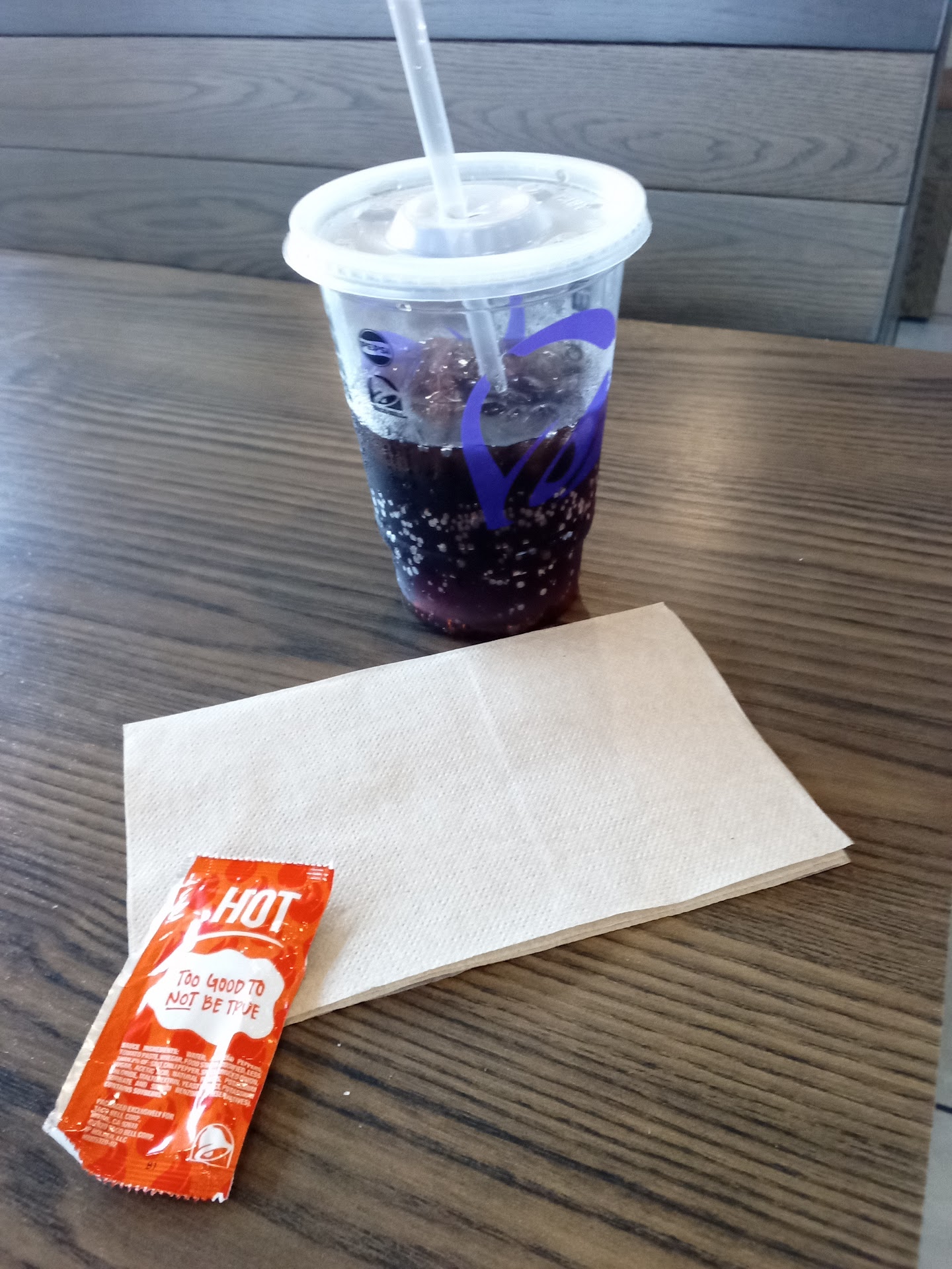 Read moreI can't remember the last time I came to a Taco Bell --- but I am reminded of why with this visit! I am not going to the Self-Kiosk to order! One regular Crunchwrap and a small Pepsi for here. 2 seconds to order! 10 minutes to navigate on the kiosk! Then they call my order --- and lo and behold, it is in a to-go bag! Then the girl who took my order says, "Oh, it's for here," before I can tell her again! Then I get one (1) sauce packet and it's the WRONG spice level. But this next thing is the KILLER --- I get (1) single napkin! 🤷🏽♂️ So I look around for the table where the hot sauce packets and other condiments and utensils are, that I remember from my last visit! There are none! So I have to wait at the front counter, where no one is! Oh, and the Pepsi I ordered turned out to be something other, so I look for the soda machine to pour it out and get a Pepsi . . . and guess what? The girl tells me, "It's broke!" Well take some of the $11 for two (2) items I ordered and get it fixed! I DO KNOW THAT I WILL NEVER COME TO THIS PARTICULAR TB . ....