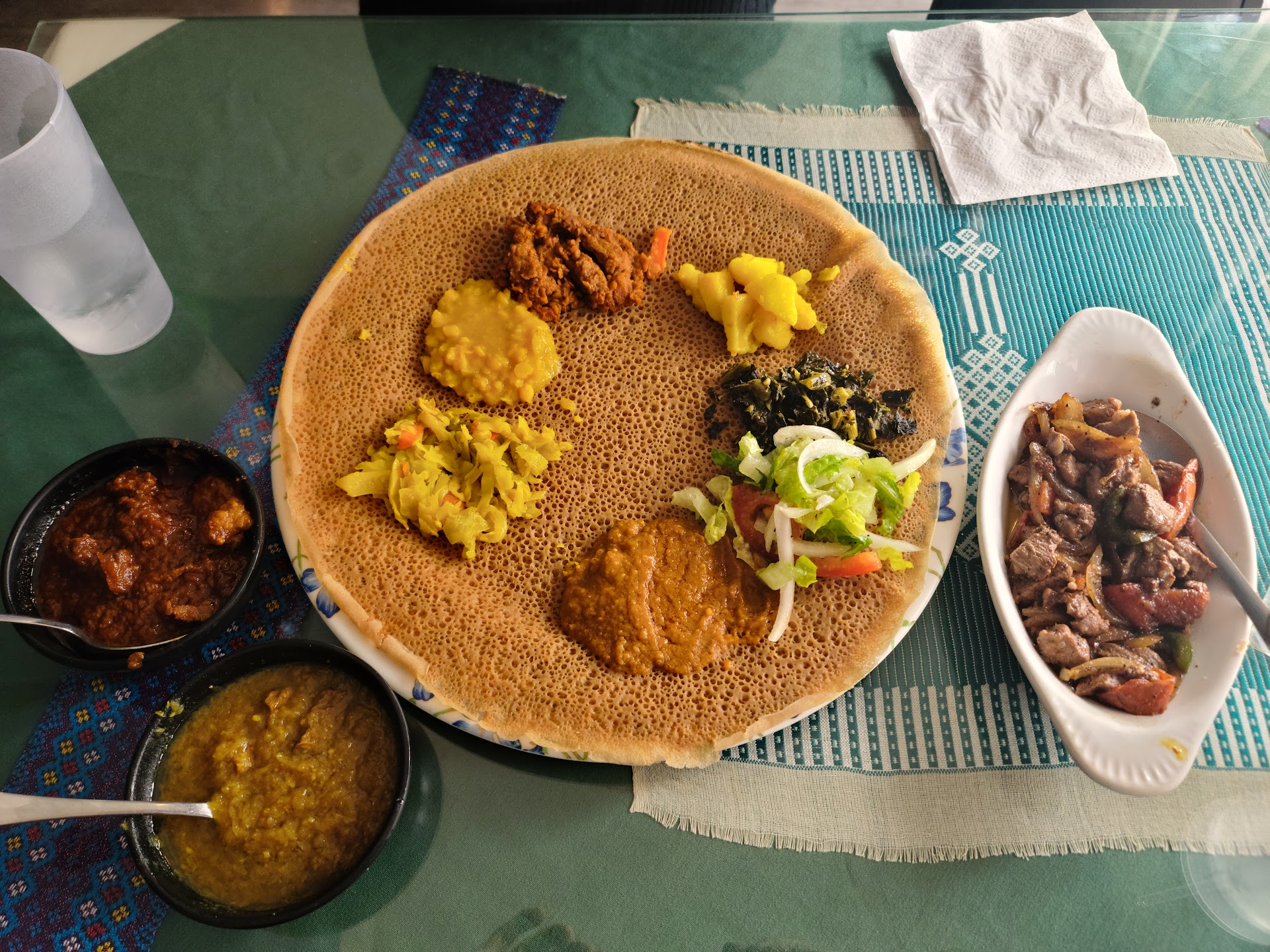 Read moreThis restaurant is great! We came in around 11:30 on Saturday for lunch and were greeted by a friendly woman. We all sat at a long table by the window and reviewed the selections on the menu. Being my first time here I wanted to try something that had various dishes on it so I could get some variety; I ordered the vegetarian delight. It came out on a sourish tasting flat bread called inerja, the texture was reminiscent of a crepe. I liked all the vegetarian selections, the spinach was my least favorite although I am typically a huge spinach fan. My favorite items were the Shiro Wot, the cabbage blend, and the potatoes and carrots. I also really enjoyed the light freshness of the salad, the dressing was amazing!
