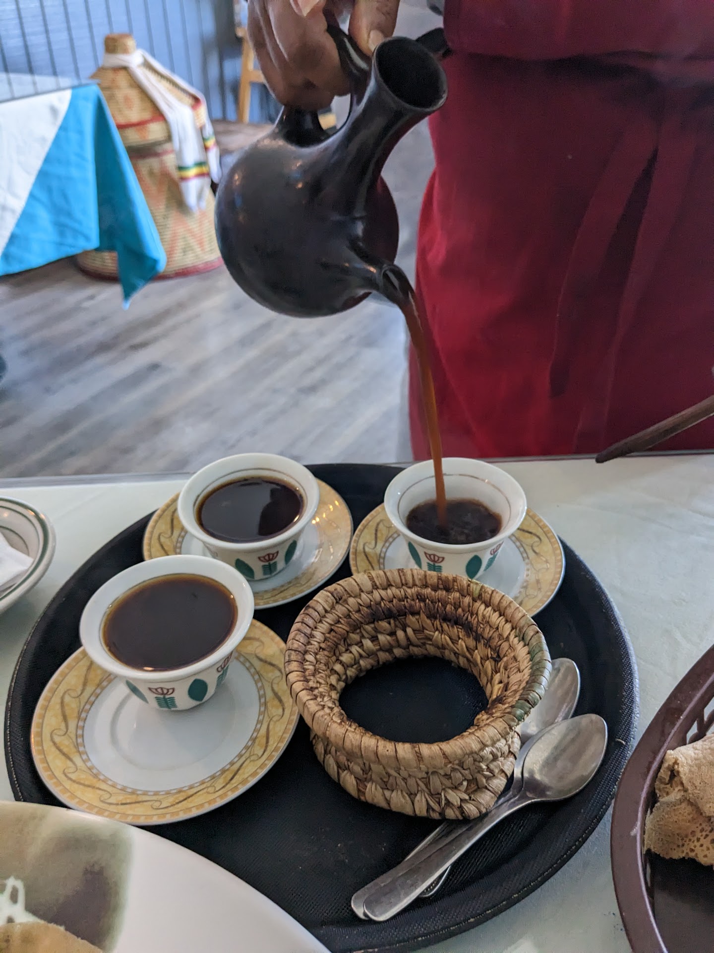 Throughout our entire time here I felt very at home and comfortable, as if a friend's mother invited me into her home to eat. My husband had taken it upon himself to order us all coffee at the completion of our meal and I am so glad he did, that in itself was a wonderful experience. First she brought out the beans as they were roasting to show us and have us smell, she said this was a traditional custom and I loved it! She then brought out the coffee pot and little cups and served us all. The coffee was delicious, worth the wait, and totally made with love - I could taste it. Whenever I have another hankering for Ethiopian food, I will...