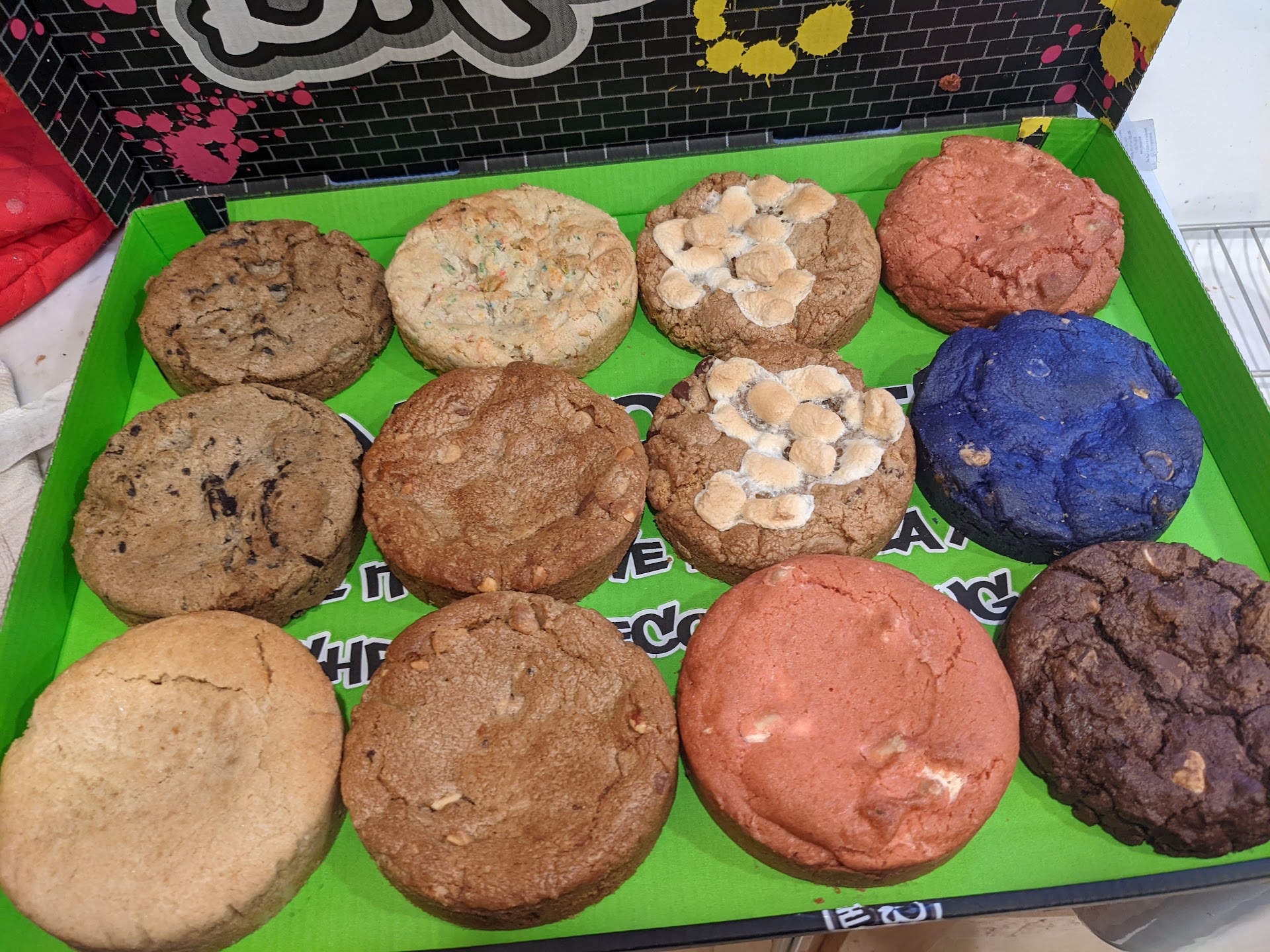 Picked up 12 cookies for $27 (special they were having) so i grabbed 4 chocolate chip (one for each of us) then grabbed 2 of some other flavors so we could each try half.