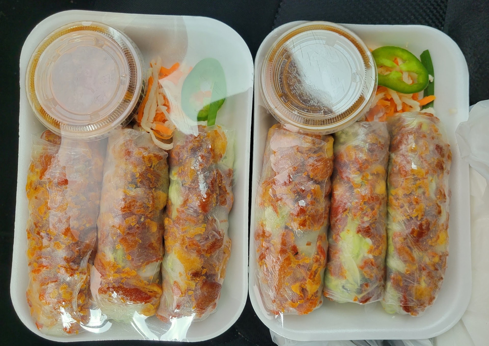 However, we found that the egg rolls were quite different this time. They weren’t bad, but they didn’t have the same delightful flavor as the previous day. I also tried a sandwich, which I didn't dislike, but I found the barbecue meat a bit too sweet for my taste. On the bright side, the baguette it was served on was hot and fresh!