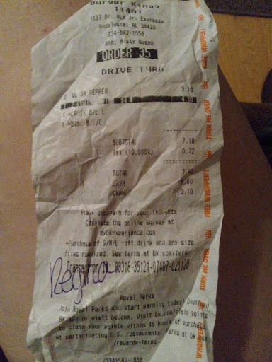 Read moreI never really leave reviews but I felt the need to warn people of this place. This was the worst fast food experience I've ever had. First we had to wait probably 10 minutes to order (when there was only one car in front of us) then another 10-15 min to get our food. While sitting in the drive thru the cashier was drinking out of an open cup, which was sitting out on the counter. Once we received our drinks and tried them, they did not taste normal. Once we got our food, we were missing one of our fries, to which they handed us another bag containing an order of fries and onion rings (which we didn't order). We had ordered a plain double bacon cheeseburger, a double cheeseburger, and 2 fries. We received 2 single burgers one with ketchup and the other with mayonnaise, 2 orders of fries and an order of onion rings. We didn't want to complain and wanted to be on our way since we had a long drive ahead of us so we ate our food, and went inside to use the restroom. The restrooms were dirty, both men's and women's. The women's sink barely drained and my husband said the men's sink looked like it hadn't been cleaned. There were at least 2 customers that were complaining/returning their food on the inside. Also all of the doors were propped open because their vent hoods were broken, so the whole store was smoky...
