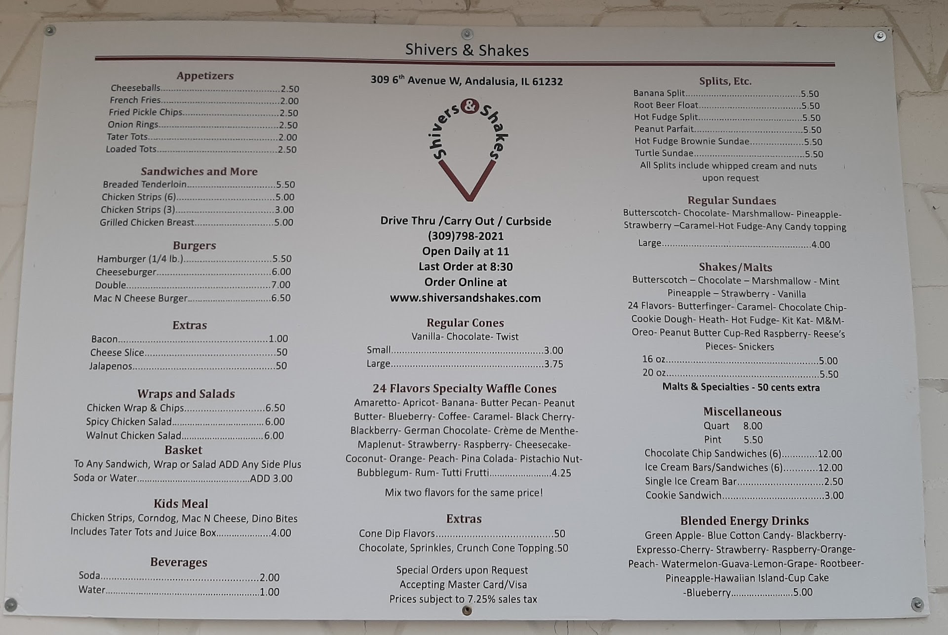 Read moreI've drove by Shivers & Shakes for a very love time and have never stopped. Well today I did and I regret not stopping before. We got 2 butterfinger shakes and they are probably the best we've had. They rival Whiteys and to tell you the truth I would drive there to get them again than go to Whiteys. Do your self a favor and stop in and get some food there wonderful...