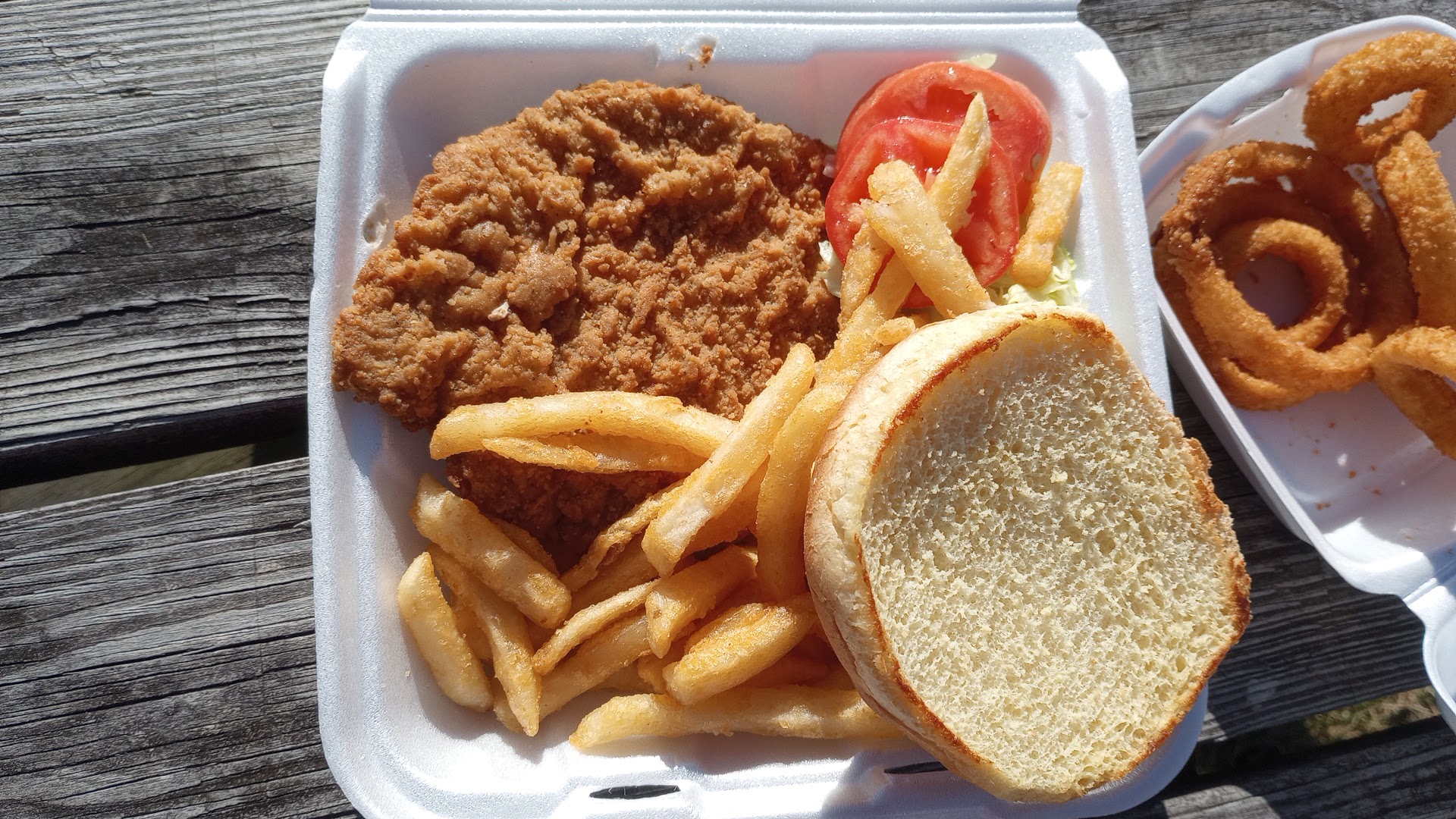 Read moreOne of Anderson's best tenderloins. We've tried 7 tenderloins in Anderson and this is our 2nd favorite (1925 Pub House is our favorite, perfect tenderloin and compostable packaging). We wanted to try the breaded and grilled tenderloins, but they had run out of the grilled which is a shame because the breaded was great. they make The tenderloins in house. The breading was crispy and nicely seasoned. there was a good pork to breading ratio. unfortunately there was some inedible gristle which should have been trimmed. We asked for extra tomato and didn't get it, just 2 small slices of roma that covered maybe a third of the sandwich. The fries and onion rings were hot and crispy. The onions thick and the breading nicely seasoned. Disappointingly they put everything in styrofoam instead of something...