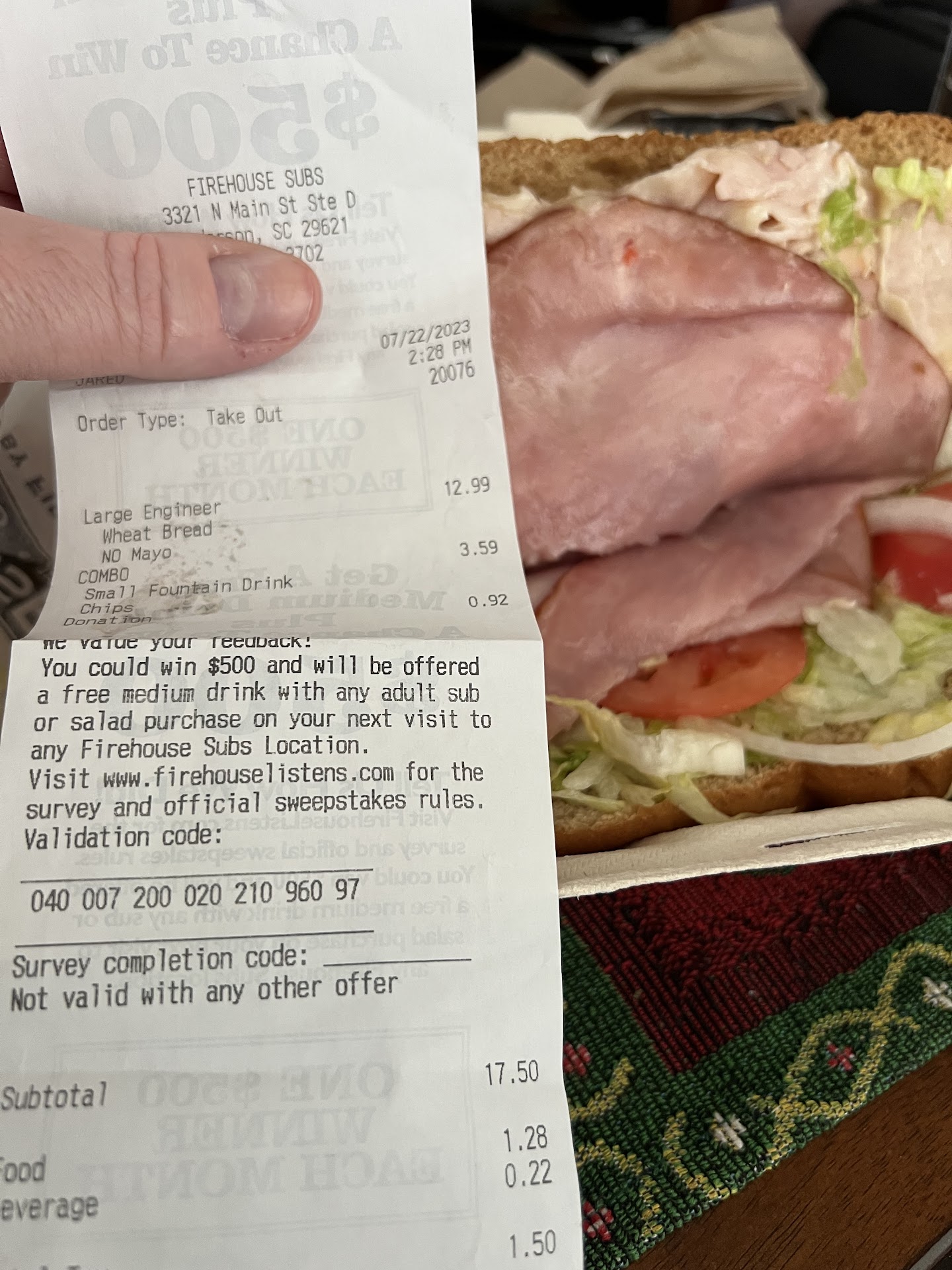 Read moreI placed a $35.00 order tonight 11-13-22 through the firehouse app for pickup at 6:50pm. As if the Wait itself wasn't long enough, I get home and EVERYTHING in the bag was not right or just completely wrong. I'm beyond irritated. It's been a long day, hence the reason I decided to pick up my families dinner for tonight from firehouse instead of cooking myself. All I did was pay Firehouse $35.00 I didn't really have, just to give us food we didn't order & completely ruin our supper for the night. Now I'm out the money I gave firehouse, and still ended up having to spend more money and still cook , because my family didn't eat the food that was given to us and I don't have the time nor the money to be driving another 15mins BACK to Firehouse to wait forever again to get my original order corrected and drive another 15mins back home. I'm now just extremely tired , still hungry and so aggravated, I could go through a brick wall. I use to Love our local Firehouse and even though it's a little pricey, I didn't mind paying for it because of how great the services and food was. But this is becoming a Recurring & Unacceptable Bad habit for the Firehouse in Anderson, SC. I'm beyond over it, and I don't believe my family will be making the choice to go there anymore. Get it together Firehouse. It's subs, not rocket science!