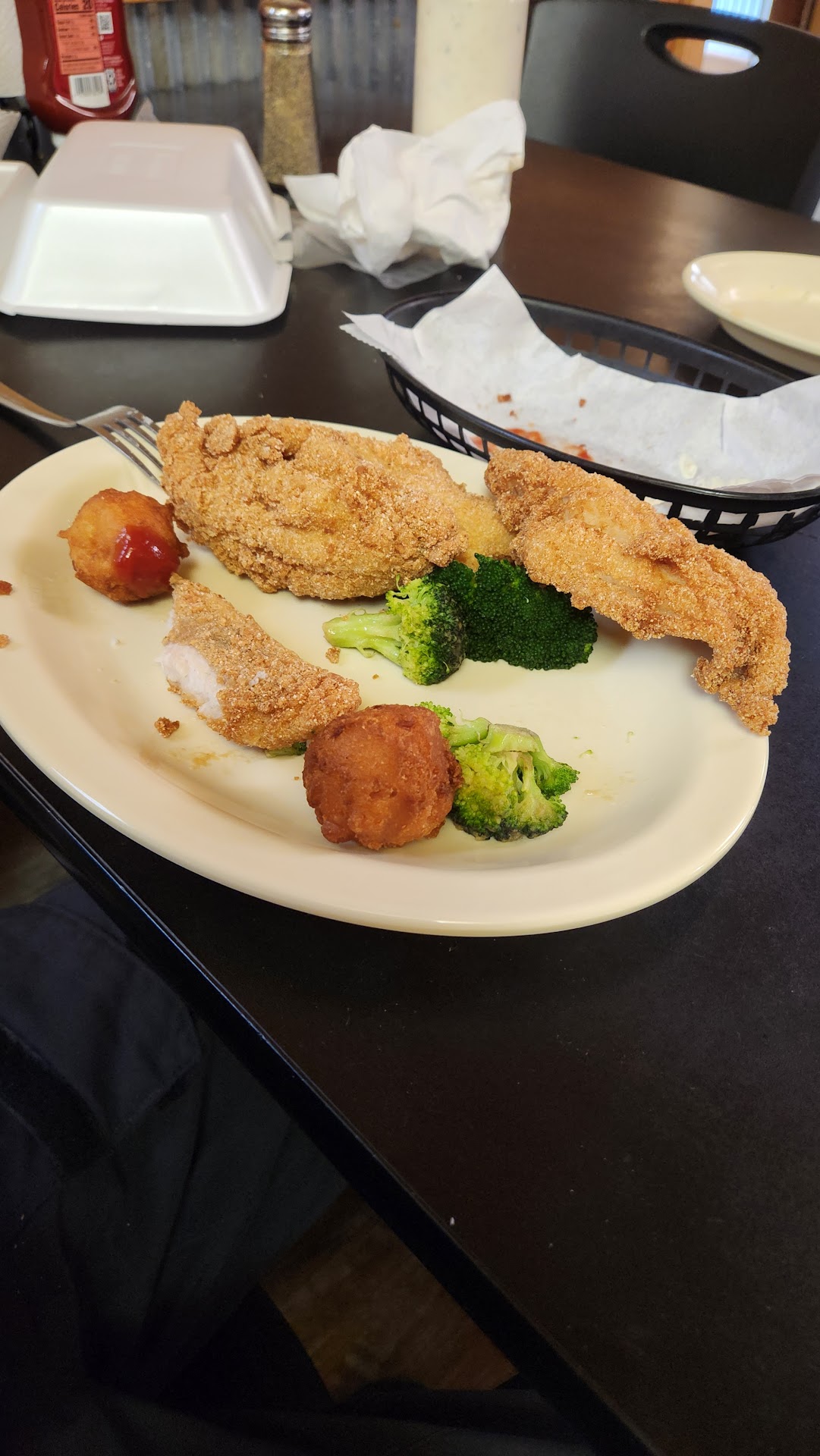 Read moreWent on the advice of a friend who lives in Lester. Great place to eat. Price was more than reasonable at $15+tip. Their menu includes seafood choices such as shrimp, scallops, etc. Ordered a medium size catfish filet dinner with choice of sides and trip to the salad bar. As soon as she brought my plate, I told her I was going to need a "to go" box. Don't let the crowded parking lot fool you, there was no wait and the service was friendly and fast. Young lady at the register advised me that Friday and Saturday nights ARE crowded. Sunday after Church can also get busy. Fish and hushpuppies were cooked to order and fresh, not sitting under a heat lamp for three hours. This place is a good distance from home but worth the drive. It's a simple, yet delicious country style dinner served by some remarkable folks who care for their customers. Pardon the half eaten plate, I forgot to snap a photo before I dug into it. Dessert from the salad bar was also included-banana pudding...