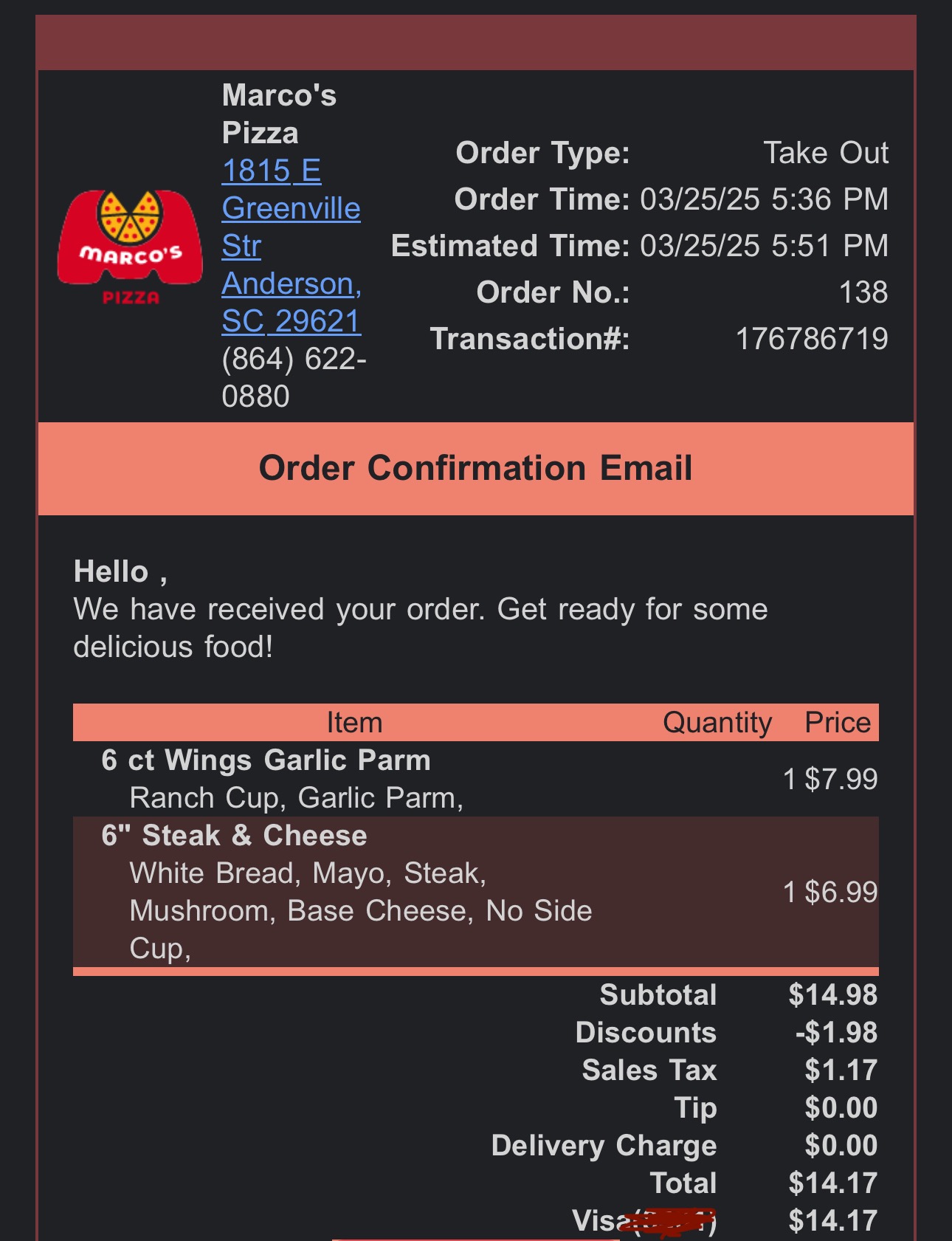 Read moreWe ordered online with a delivery time of 5:30. My husband called at 5:45 to check on the status of our order because the tracking function was recently removed from the website, and was on hold for over 10 minutes before someone finally answered. We were told they only had 1 driver and a storm was brewing, hence the delay, and that our order should be delivered in 10-15 minutes before the associate hung up on my husband. When 20 minutes passed and our order still wasn't delivered, he tried calling again and still can't get anyone to answer the phone. The order is now over an hour late, and the website doesn't offer the option to cancel and get a refund. Regardless of whether or not this order finally arrives, this will be our last time ordering from Marco's. My suggestion is to save your money and your time, and...