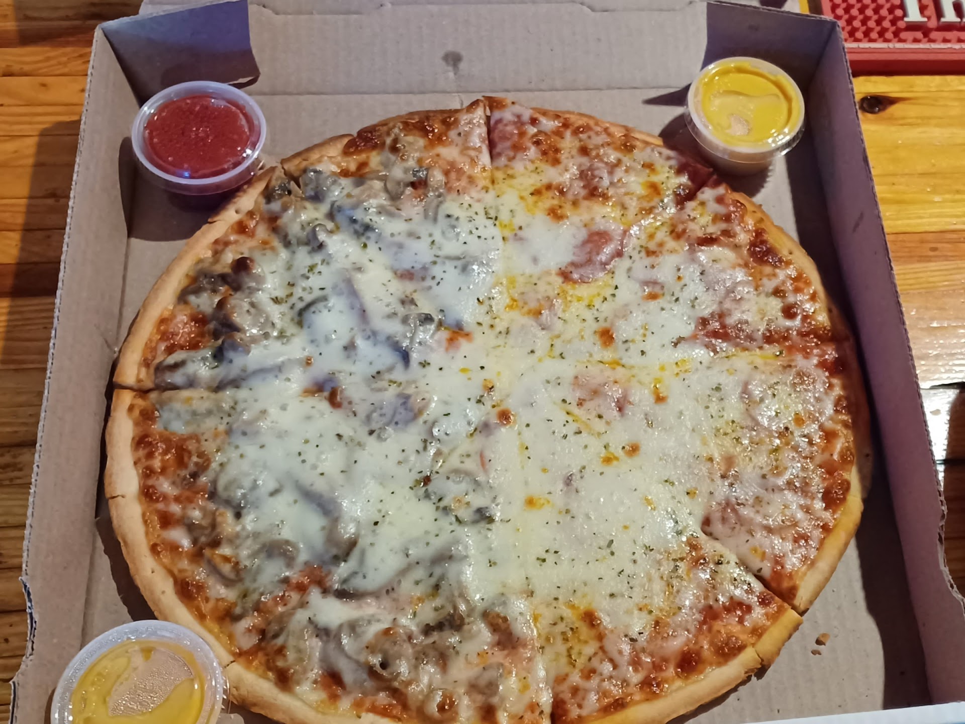 Read moreMy husband and I went here for a quick dinner date and we got a 12 inch 3 topping pizza and 2 regular drinks and it was under $20. The pizza was really good. It is thin crust and a little crispy but we like our pizza that way. The place was insanely busy but the staff and other restaurant goers were friendly. It is a little smoky in there but the pizza makes it worth it to me. Great small town food....