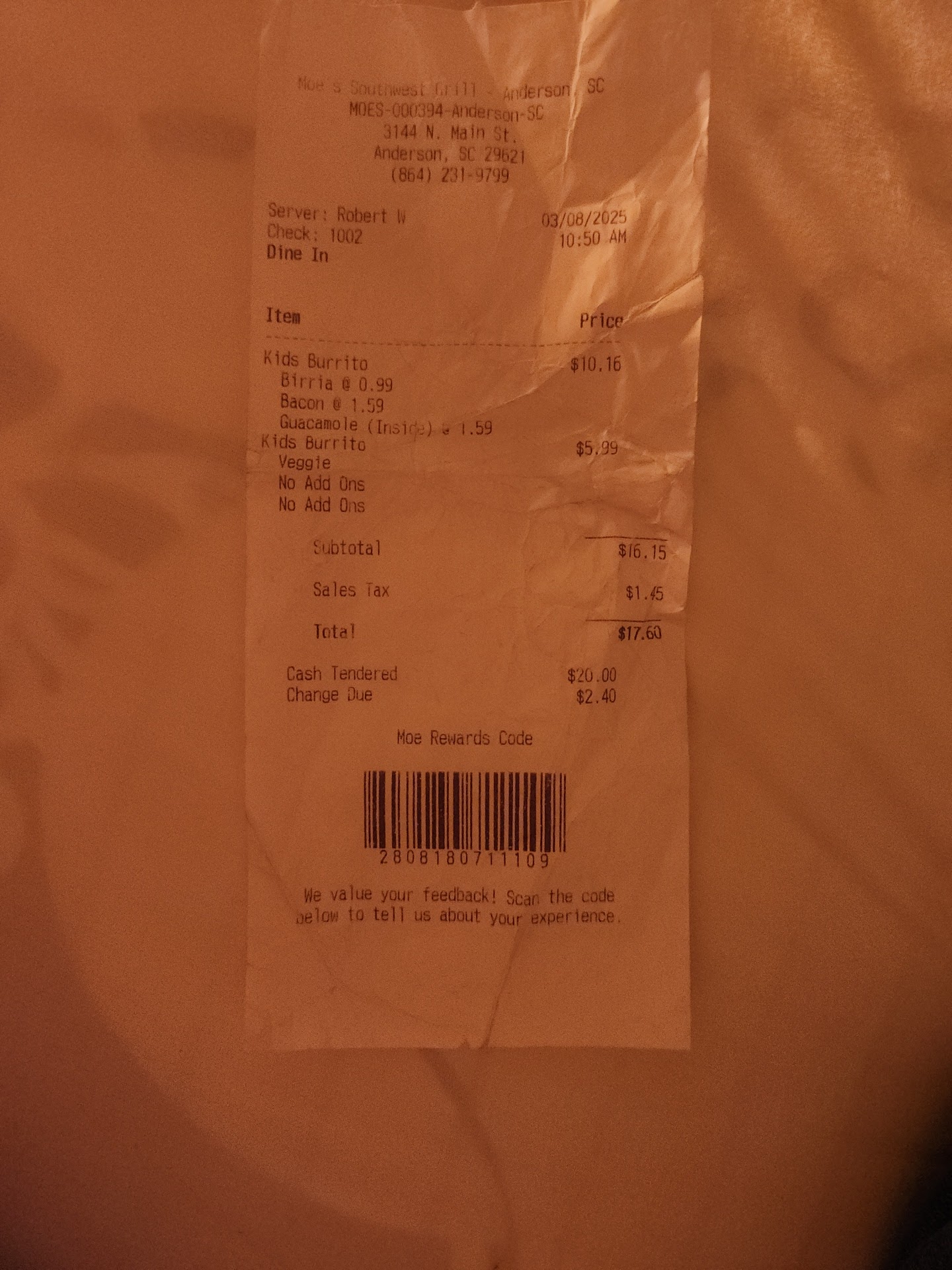Read moreFirst off, Jerry is awesome. Love him, but that's where the good stuff stops. Went this morning with the family for free kid meals. Was met at the door saying the system was down and wouldn't be up for 5-15 minutes. Okay, we'll wait. Another guy goes in and is told the same. He walks to his car and walks back in saying he ordered online and paid online. Was told to cancel his order. He showed he couldn't. They began fixing his order. We asked if they were up and running and were told no. We asked about the guy whose food was being prepared and were told he ordered online through the app. We asked if they could process through the app and were told no. We asked again why the other person's food was being prepared. Was told again he'd ordered online. Once again asked if we could order online and get our food. Guy talked in circles to the point we gave up and left.
