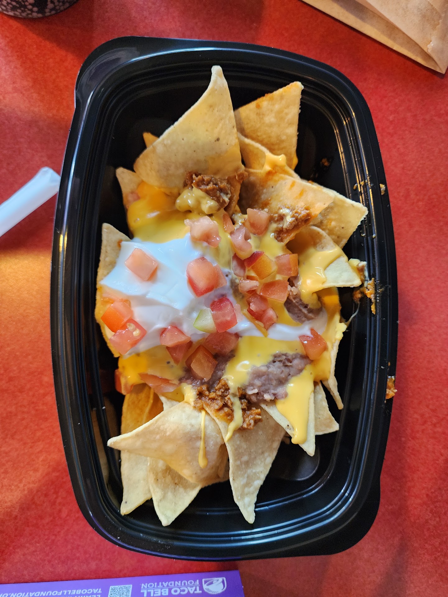 My daughter and I stopped by for lunch after she got outta school. She's a senior at Westside. She gets out early half day student. We decided to check out the menu as we waited patiently in line behind other guests. We placed our order ourselves using their self-order service machine. I ordered The combo 3 soft shell tacos 🌮 with lite cheese & drink for $7.99. My daughter ❤'s the new nacho Dorito tacos 🌮! So she ordered 3 shell tacos and drink for $10.09! Expensive on the price but so worth it. We 💙 🌮 Taco Bell 🔔 and loved it more when prices were kept low. Taco 🌮 for .99 back in the day. Service was fast! Less than 5 mins and they were busy during lunch rush! Drive thru orders! For some reason no employee was up front taken care of customer's in line waiting to order so they ordered n paid themselves. We got our food quickly but without large cups 🥤..We had to ask for cups. We decided to eat in the dining area. Tables were clean and sauces were fully stocked. Napkins included. Drink station was a mess. Water, ice n soda everywhere. Somebody didn't clean up there mess. Other than that. Great experience. We will return soon. I 💙 the reward app. It's free! Easy to earn points and free food! Love the big party packs! Nacho's! Mexican pizzas 🍕 ! Give everything a try...