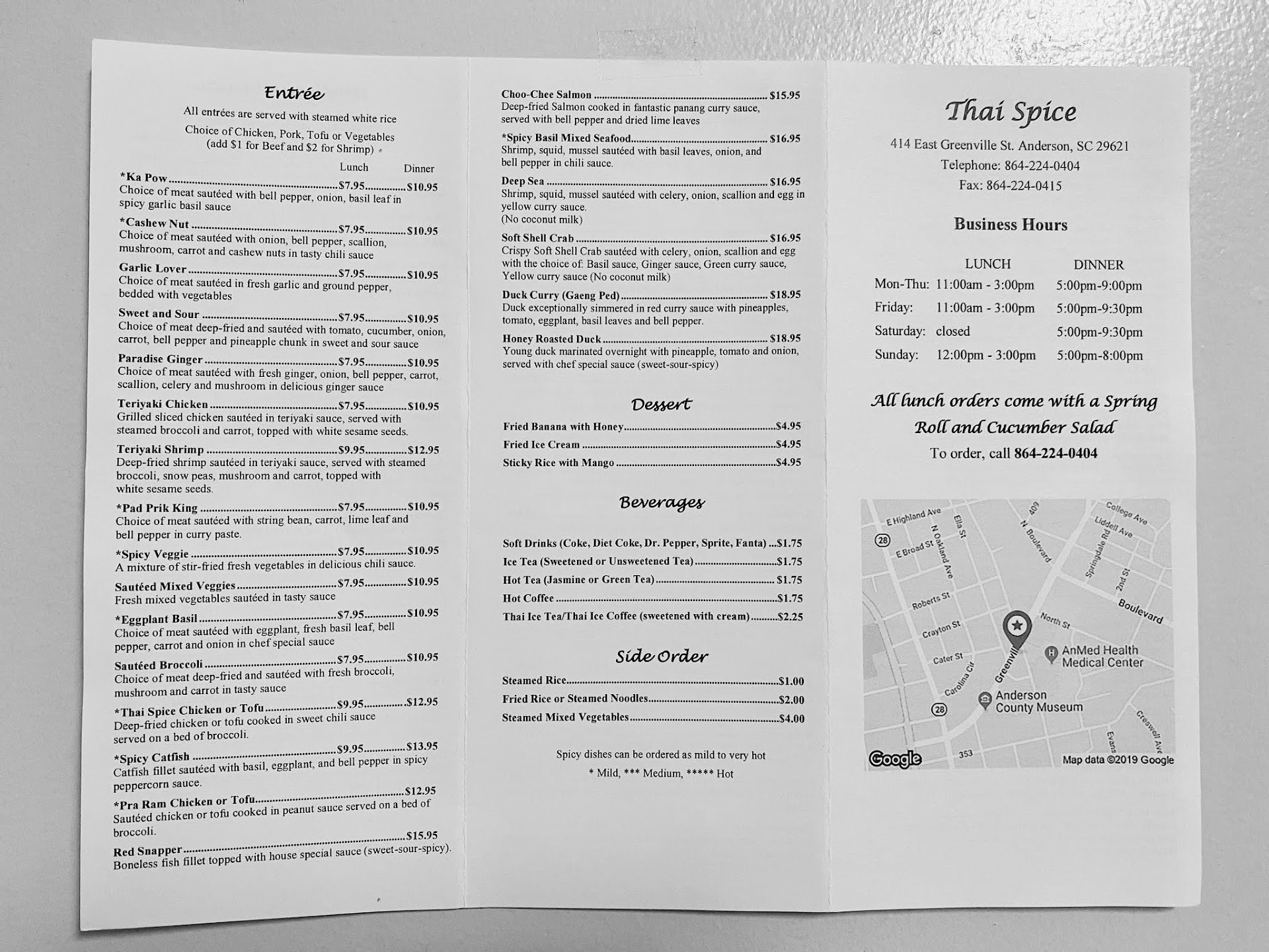 Their Thai Tea is marvelous, that's for certain. I don't make it to Anderson very often, but when I do I always eat there. The menu is Thai. Thai Thai Thai Thai Thai. There's no Chinese, there's no Sushi, there's no Korean, there's no Americanized Asian food in the house - this is Thai. Hell there isn't even an egg roll on the menu.