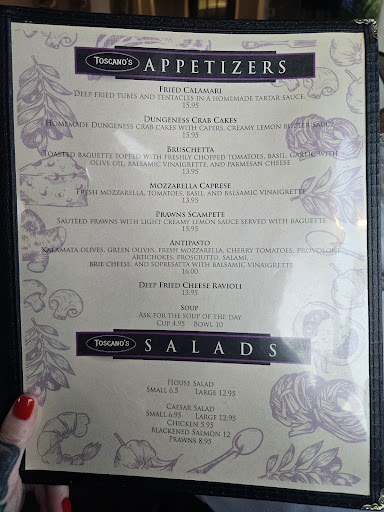 Read moreWow, what a surprise and delight to have such a fantastic dinner at Toscano's the other night. From the ease of calling in to make a reservation, promptly sitting us down when we arrived, top notch service throughout the meal, to getting our check quickly with boxes to go. Chris was our waiter and did an outstanding job! All the wines are local and priced affordably which was nice. We started off with fresh bread and a perfectly cooked, lightly crusted calamari appetizer served with a tasty aioli. For our entrees my 2 daughter's got the pollo Alfredo which had perfect chunks of chicken breast meat in a slightly heavy cream sauce that had a nice hint of garlic. My wife had a perfectly pounded Veal marsala that was thin, had a wonderful mushroom sauce and a delight to eat. I had the grilled Ribeye in a heavy burgundy sauce. It was nice to taste the charcoal flavor combined with the tasty sauce for what was a perfectly cooked quality piece of meat. A perfect compliment. Oh, the mashed potatoes were over the top. My daughter had to sadly report, that they were better than mine. Argh. The amount of food was more than enough that we took a bunch home. We had to try one of their desserts and settled on the carrot cake as the berry cobbler was sold out. We had a wonderful experience, fantastic service at a price that was reasonable for today's restaurants. We will definitely go back next time we are...
