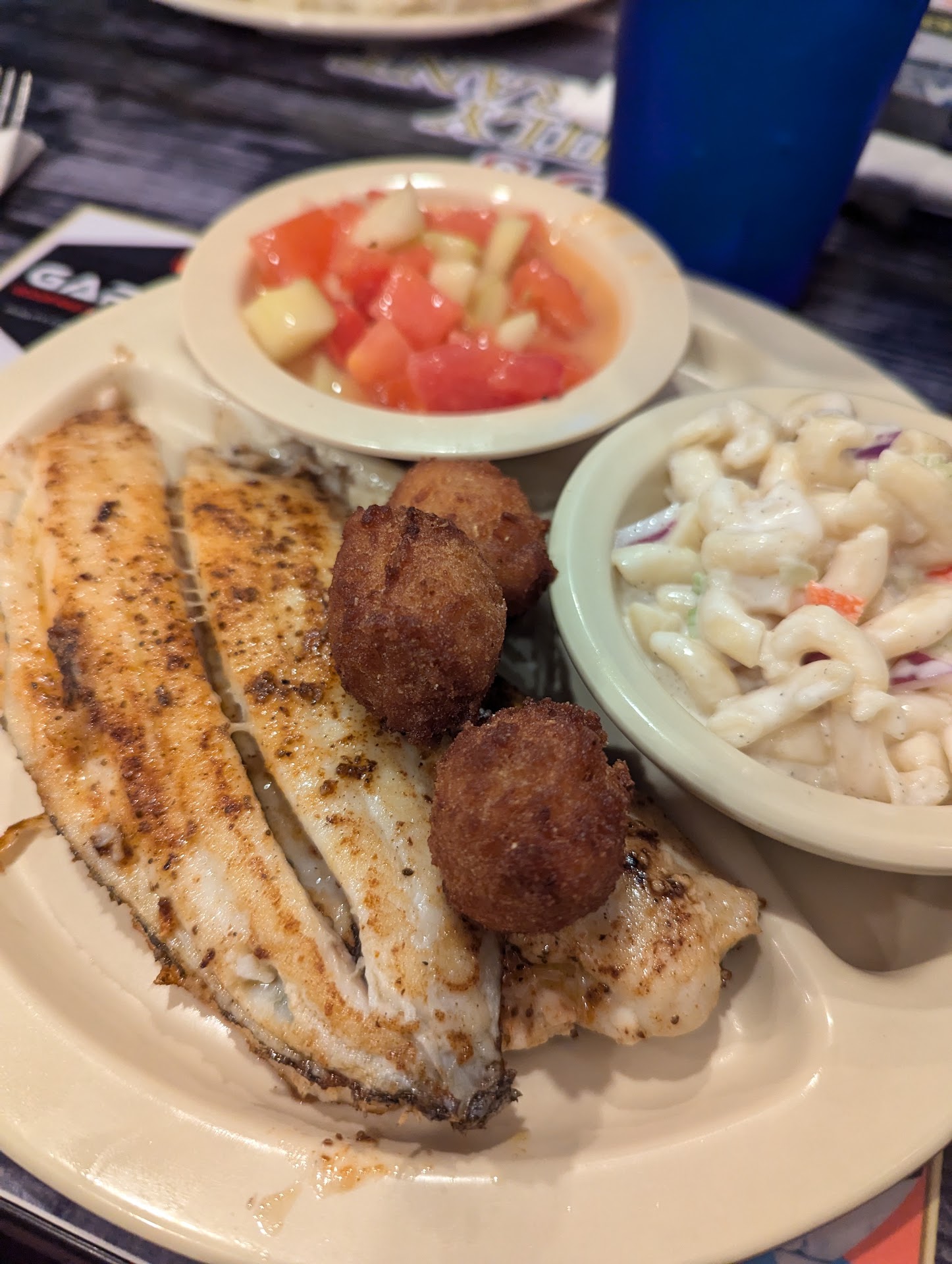 Today was my first time there. I tried one of their specials and it was excellent. I had the grilled flounder and it was extremely flavorful. The sides that I chose were the cucumber and tomato salad (bursting with flavor), and the macaroni salad (also very well done). They also gave me three hush puppies.... I'm newer to the south, and we don't really have these where I'm from lol. These are probably the best I've had. They were crispy, flavorful, not greasy, and not too doughy. Just right. They also have a little bakery section up at the front.