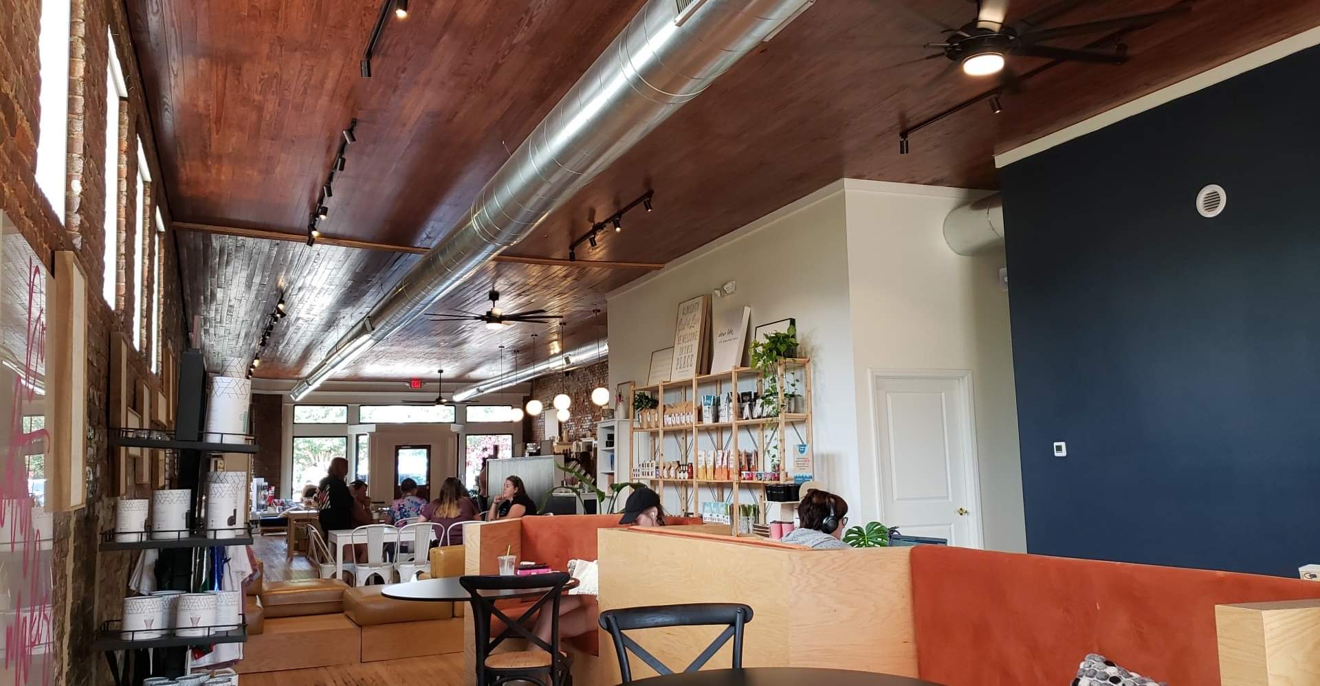 Read moreSo, I give this place 3 stars. Lots of space, clean and nice theme with the hardwood and exposed brick. The coffee is good, but not 5 bucks a pop good. And while I understand we are in the bible belt, I can understand a shop having some Christian things on the wall or on the shelves, this place is Christian overload. Christian music, Christian proverbs, Christian overload. Lord know what's it looks like inside during Easter.