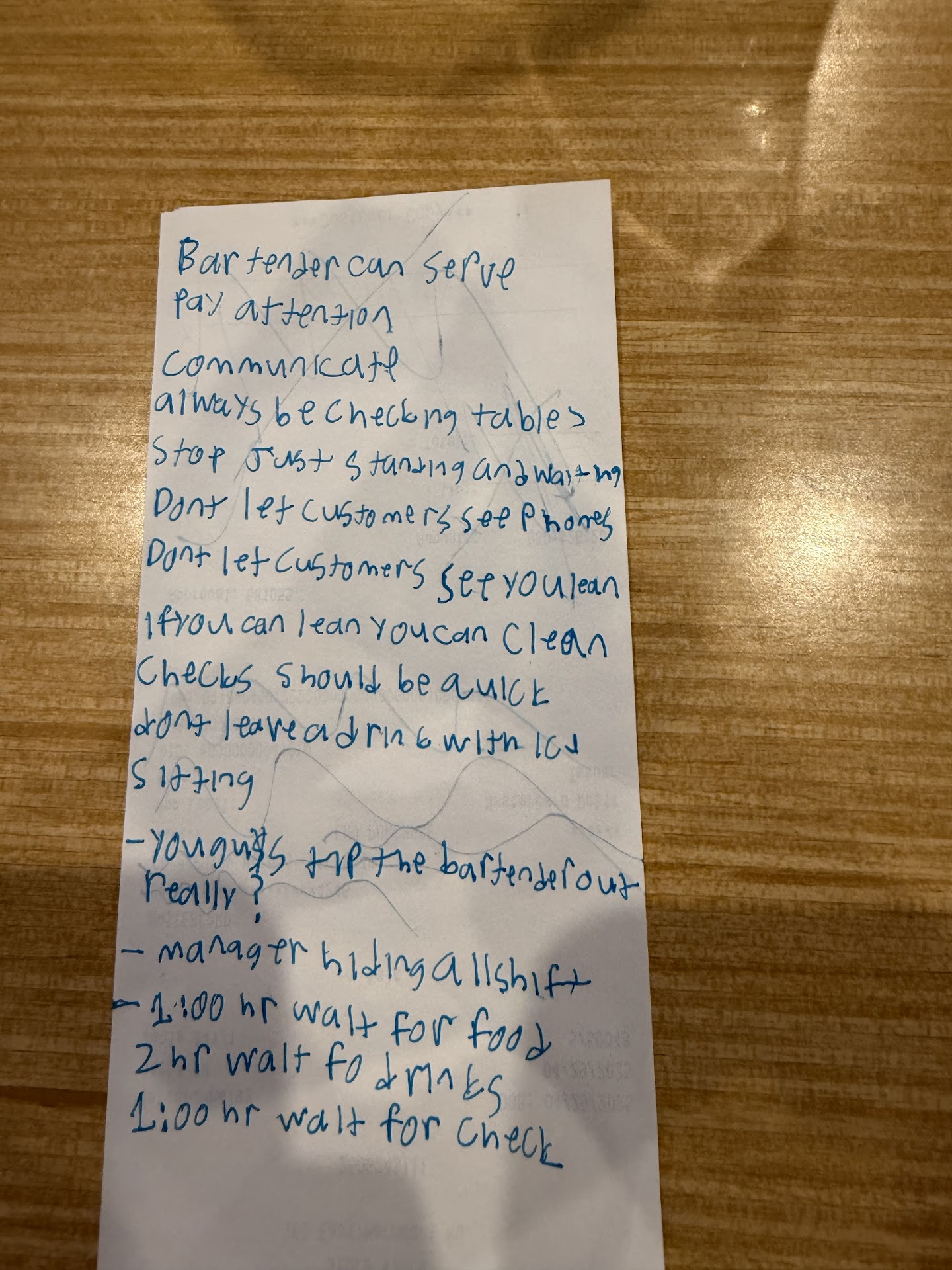 Food was great but the service was terrible it took them 2 hours to get us food or drinks and they ignored us the entire wait period we had a college senior get together of about 10 people including a professor and were the only table in the restaurant and they ignored us never checked on how we were doing we had to get our own cutlery and napkins. Never saw a manager until we had to complain to fix 2 checks it took them 3 hours into being there and it took 1 hour once we asked for the checks to get them. The bar tender didn’t serve at our table which fair if she’d had customers but she didn’t and so my second drink got made after 30 minutes of waiting and then sat behind the bar till all the ice had melted and the check had finally come. Servers were leaning on all surfaces and or on their phones I saw the manager on his phone once he finally appeared. It then took another hour for one check for one person to get fixed and two guys to get their change. Over all a terrible experience and if this was my first time having bad service at this restaurant I’d let it go but this is the 20th time I’ve been with terrible service in my 4 year college career in this town all in all I don’t know what is going on there but they clearly don’t train employees or managers and don’t know how to run a restaurant. (The image is a list of everything we were able to think of while just waiting for her to bring back our...